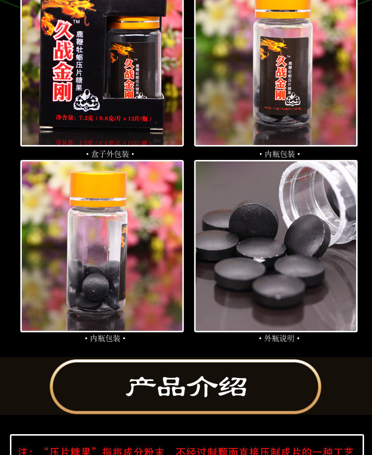 Состав: женьшень, панты оленя, ягоды китайской дерезы, хрящ акулы, кордипцепс, хлыст (искусственное культивирование), устрицы, порошок маки, женьшень (искусственно культивируется менее 5 лет), батат, корневище. и другие экстракты лечебных трав.
