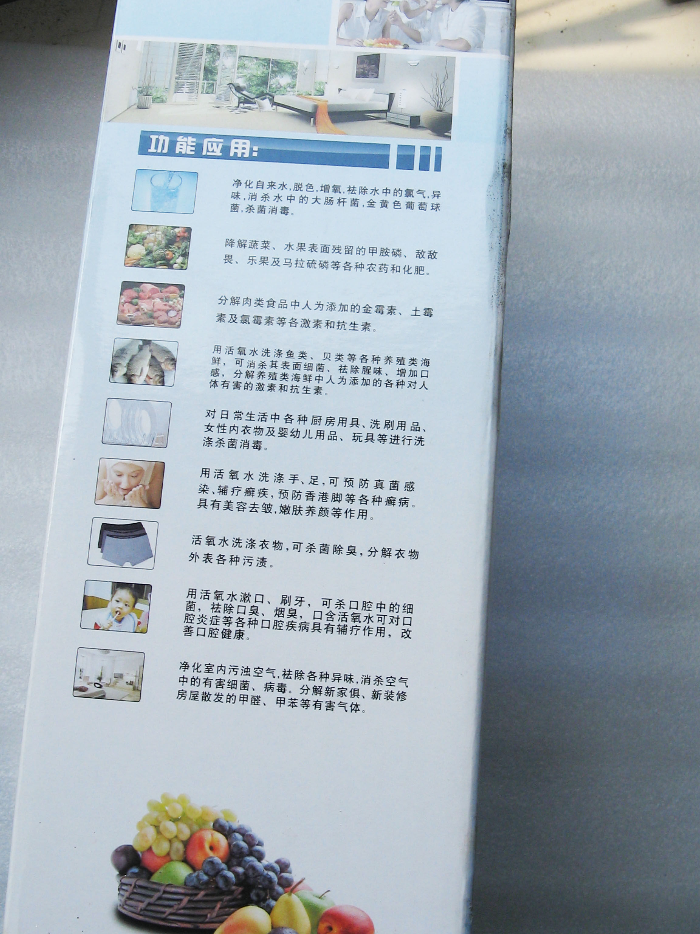 Промойте овощи, фрукты водой, затем положите в пластмассовую или стеклянную емкость, налейте воды столько, чтобы она покрыла продукты, и пометите трубку в воду. После очищения овощи и фрукты становятся более свежими, полностью удаляются остатки химикатов. Время очищения -10 минут.