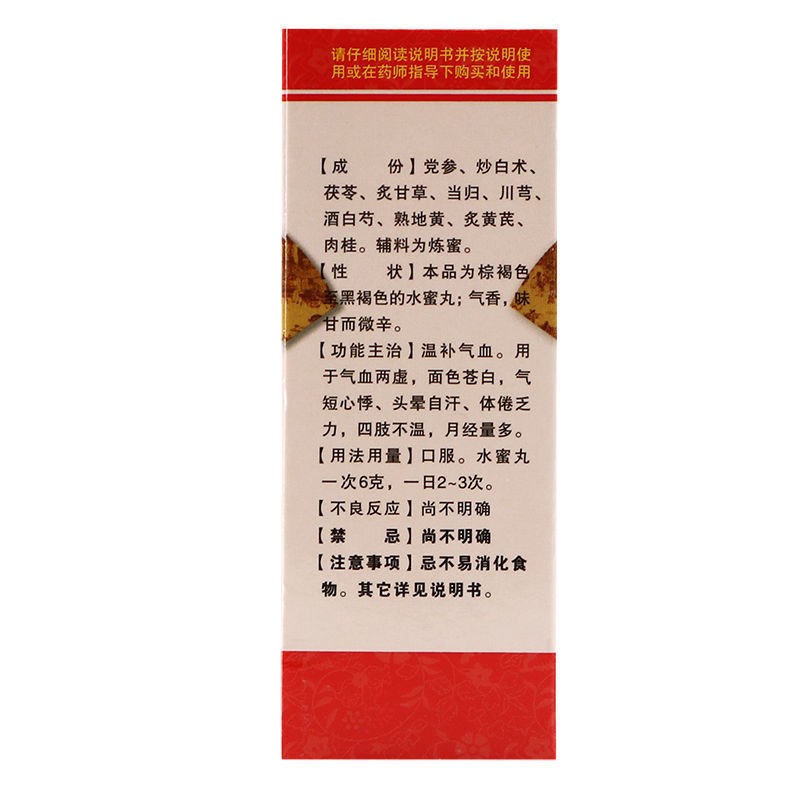 Состав: корень ремании клейкой приготовленной (shu di huang), корень дудника китайского (dang gui), корень кодонопсиса мелковолосистого (dang shen), пория кокосовидная (fu ling), корневище атрактилодеса крупноголового (bai zhu), корень астрагала перепончатого (huang qi), корень пиона белоцветкового (bais hao), корневище гирчовника влагалищного (chuan xiong), корень солодки голой (gan cao), кора коричника китайского (rou gui).