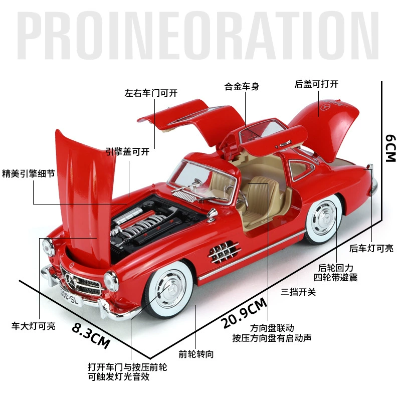 Эта модель автомобиля Mercedes 300 SL в масштабе 1:24 станет идеальным предметом коллекционирования для поклонников роскошных автомобилей и тех, кто ищет интерактивную и высокодетализированную модель.