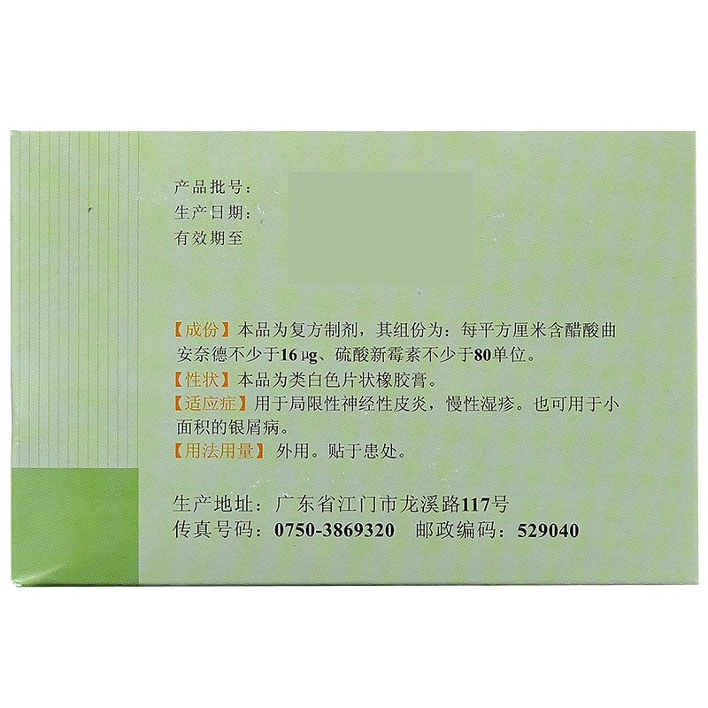 Цей продукт є складаним препаратом, і його компонентами є: кожен квадратний сантиметр, що містить не менш ніж 15 мкг ацетату триамцинолона ацетоніду та не менш ніж 80 одиниць сульфату неоміцину.