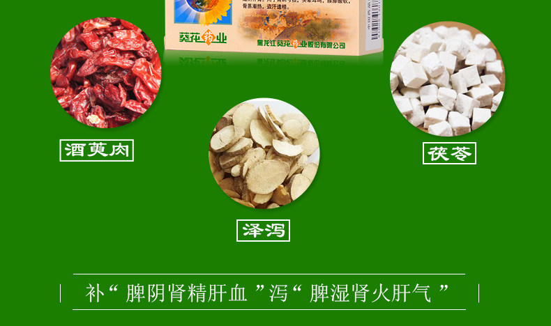 Склад: плоди корнусу лікарського, корінь ремінії клейкою, кореневище ямсу китайського, кора півонії напівкустарникового, порія кокосова, корінь частухи подорожникової.