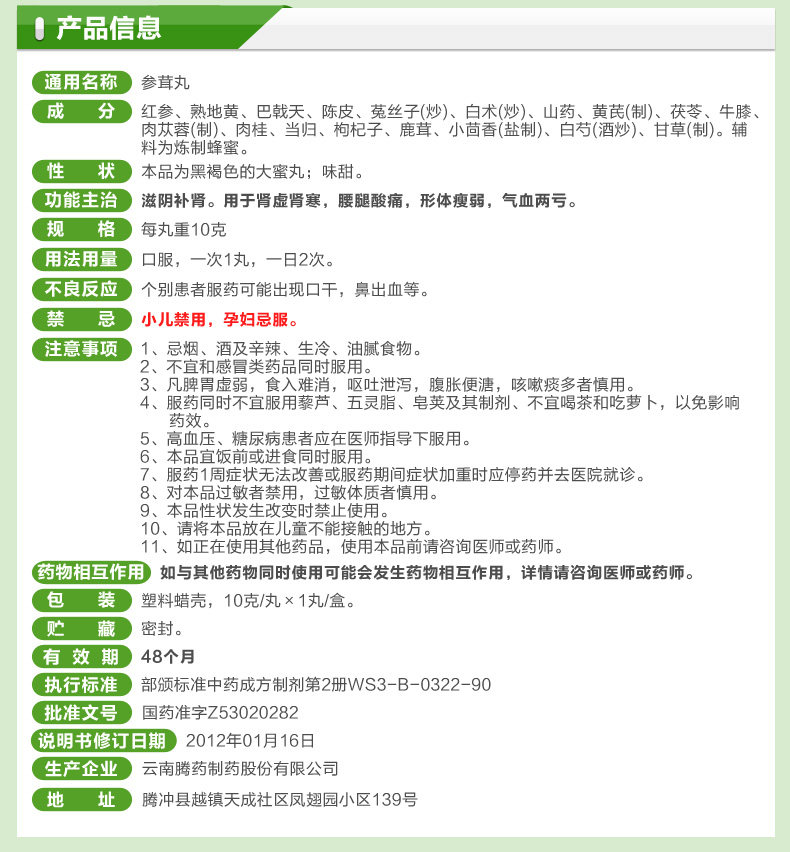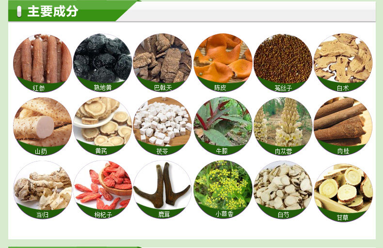 Склад: Вала (трава Хуаньхунь), панти оленя, женьшень, Дун Чун Сая Цао, мапамін, Сюелян, пеніс тибетського яка. та ін.