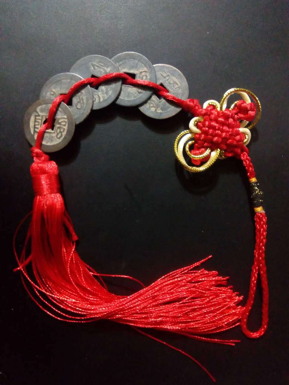 Підвіска з 5 китайських монет перев'язаних червоною ниткою з магічним вузлом і пензликом для залучення додаткової Ци цих монет. Повісьте цей амулет на північному-заході вашого дому або офісу для активації наставника удачі в північній для залучення успіху в кар'єрі. Рекомендується повісити цей амулет у машині для запобігання аварії та захисту