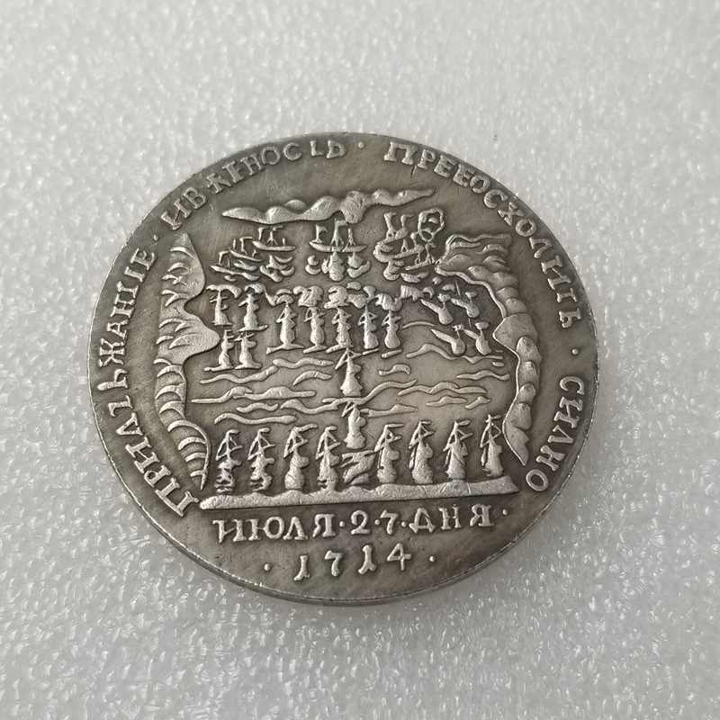 Кажашівський монетний двір, початок XVIII ст. Без отримання медальєра. Срібло, 27,64 г. Діаметр 41,2-42,3 мм. Збережність близька до чудової, красива патина. СРМ# 66. Іверсен# XLIII.4.b. Рятівський, Щеуніка# 50. Дур В.А. Каталог російських медалей першої чверті XVIII ст. Нумізмувальний збірник. Ч. 5. Вип. 2 Труси ГИМ. Вип. 49. М., 1977. С. 123–140. № 40. Дяків No 47.4 (R2). Соколов № 066.6 (R2). Біткін (монети)# М3876 (R2). Біткін (медалі)#195.Б(R2). Дуже рідкісна.