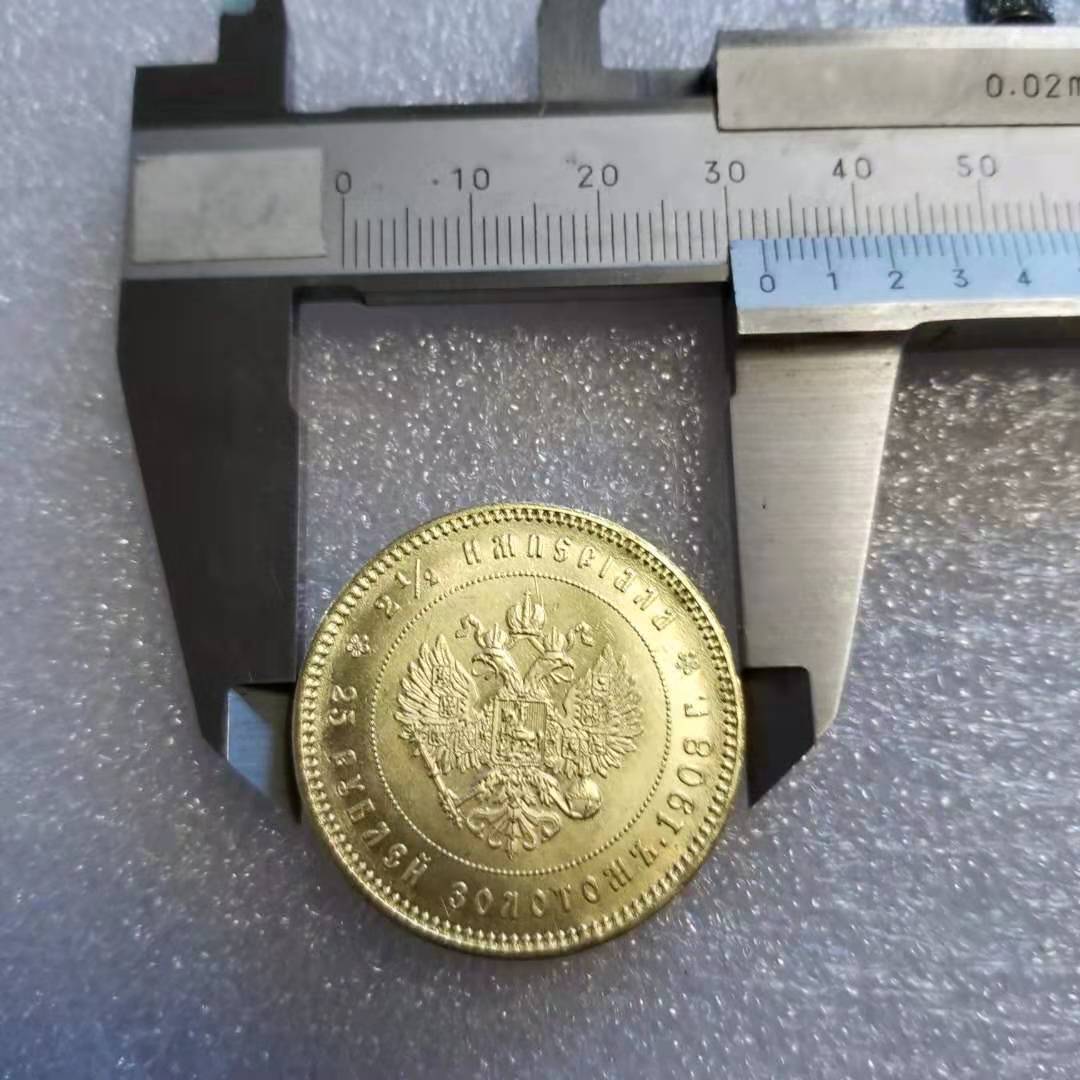 Рідка монета 2 1/2 імперіалу 25 рублів 1908 року імператора Миколи 2. Дуже рідкісна монета, випущена обмеженим накладом. На лицьовому боці відчеплене зображення Ніколия 2 в профіль, по колу напис Б.М. НІНКОЛА II ІМПЕРАТОР І СИТАНЬ ЗАВЖДИВАННЯ. На зворотному боці відчеплений двоголовий орел із державою та скіпетром. Копія 25 рублів 1908 року виготовлена з бронзи, гурт монети має напис.