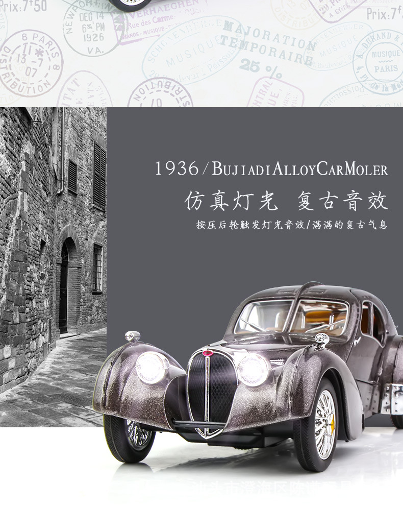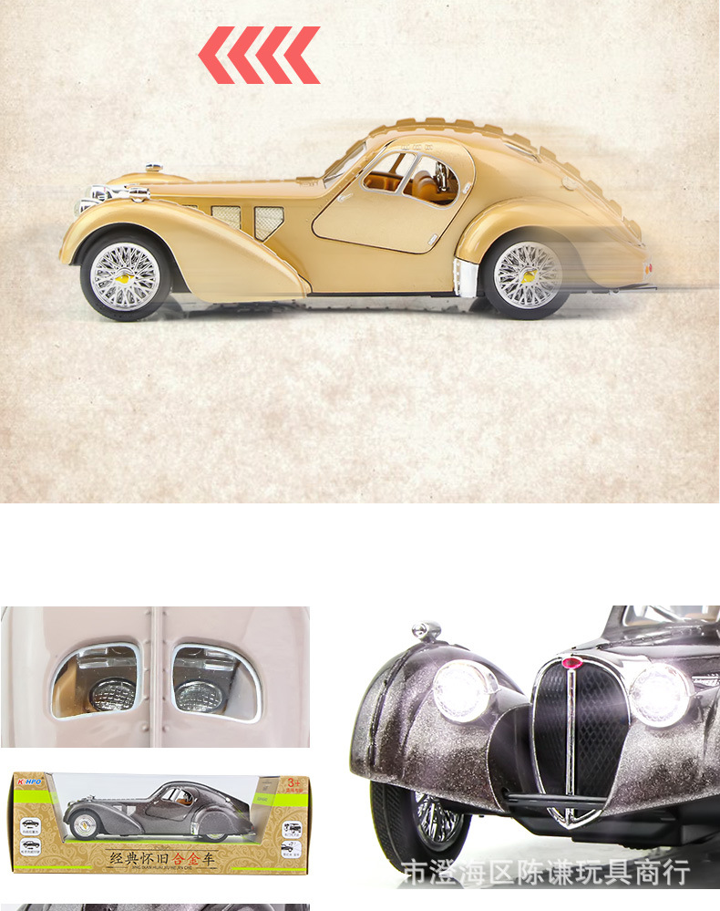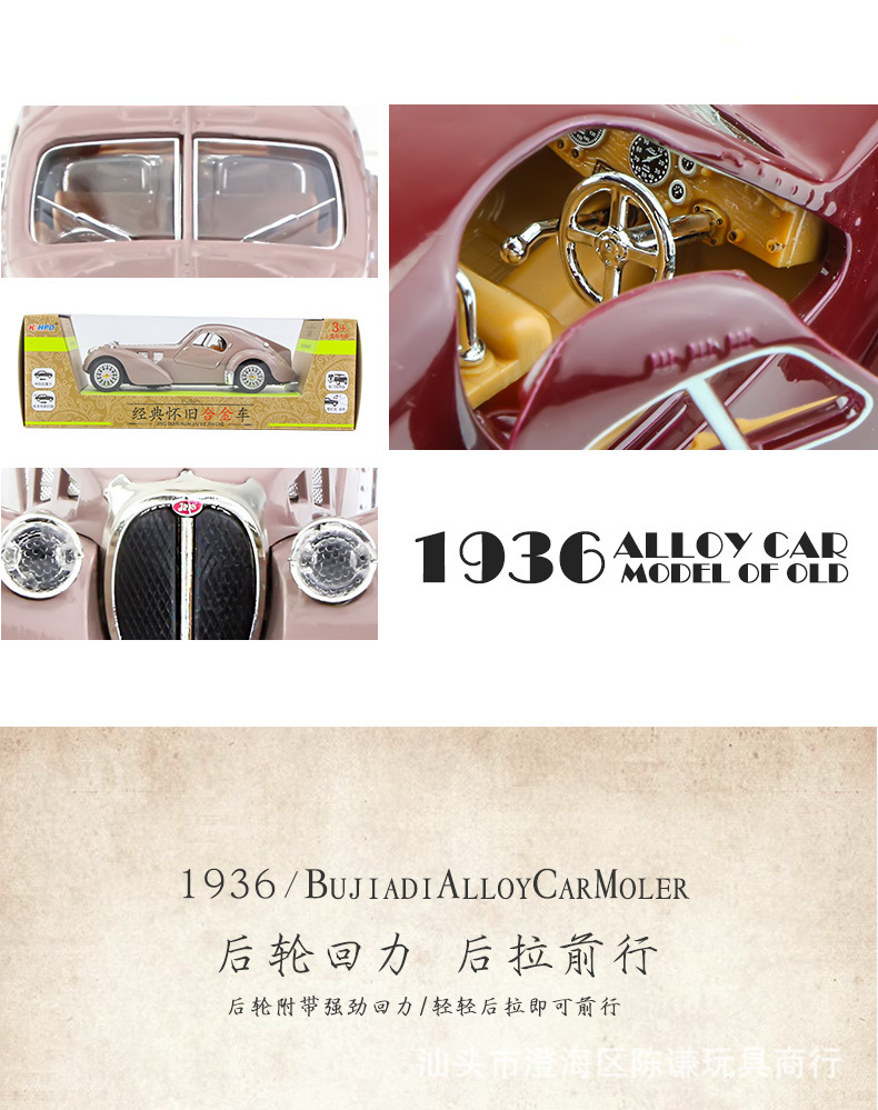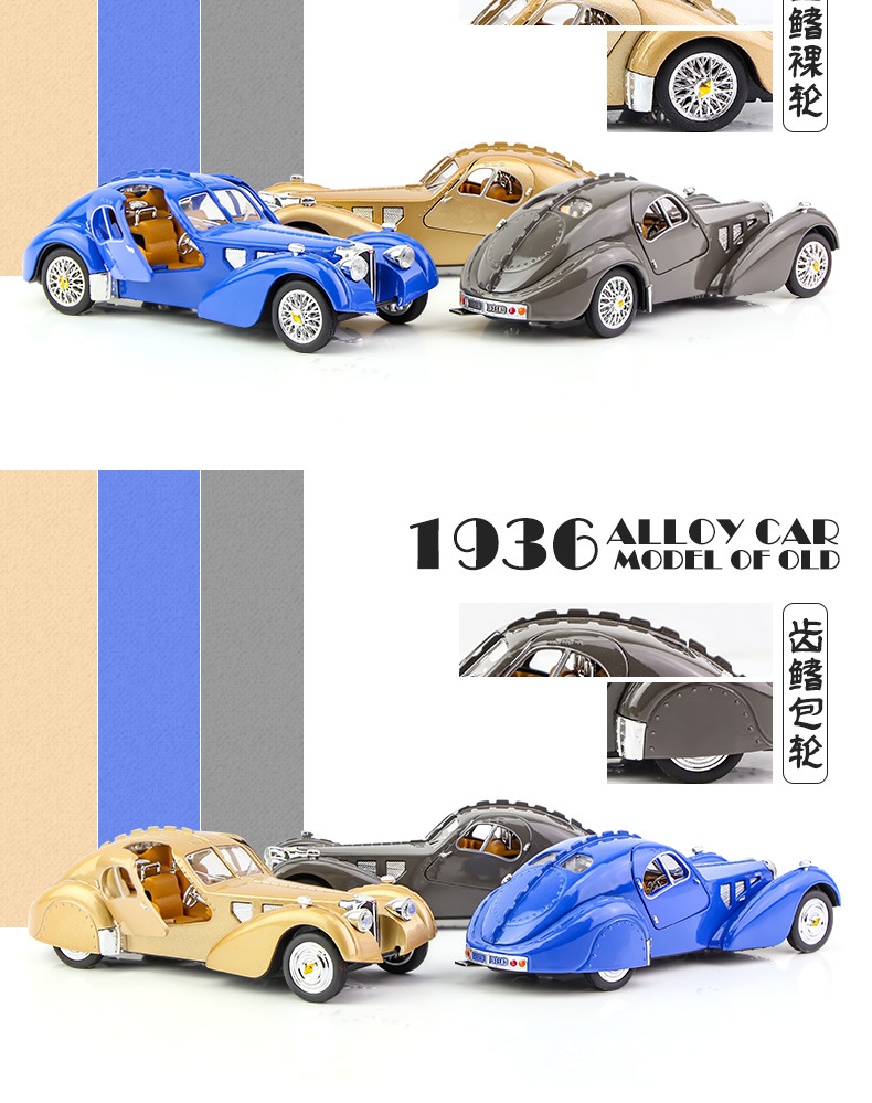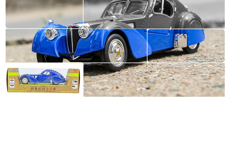 Ретро-автомобіль незвичайного вигляду синього кольору — втілення стилю, елегантності та розкоші. Іграшка виготовлена з безпечних, нетоксичних матеріалів, здатних зашкодити. Корпус — металевий, колеса — гумові, інші елементи на корпусі та всередині — пластикові. Іграшка виглядає реалістично.