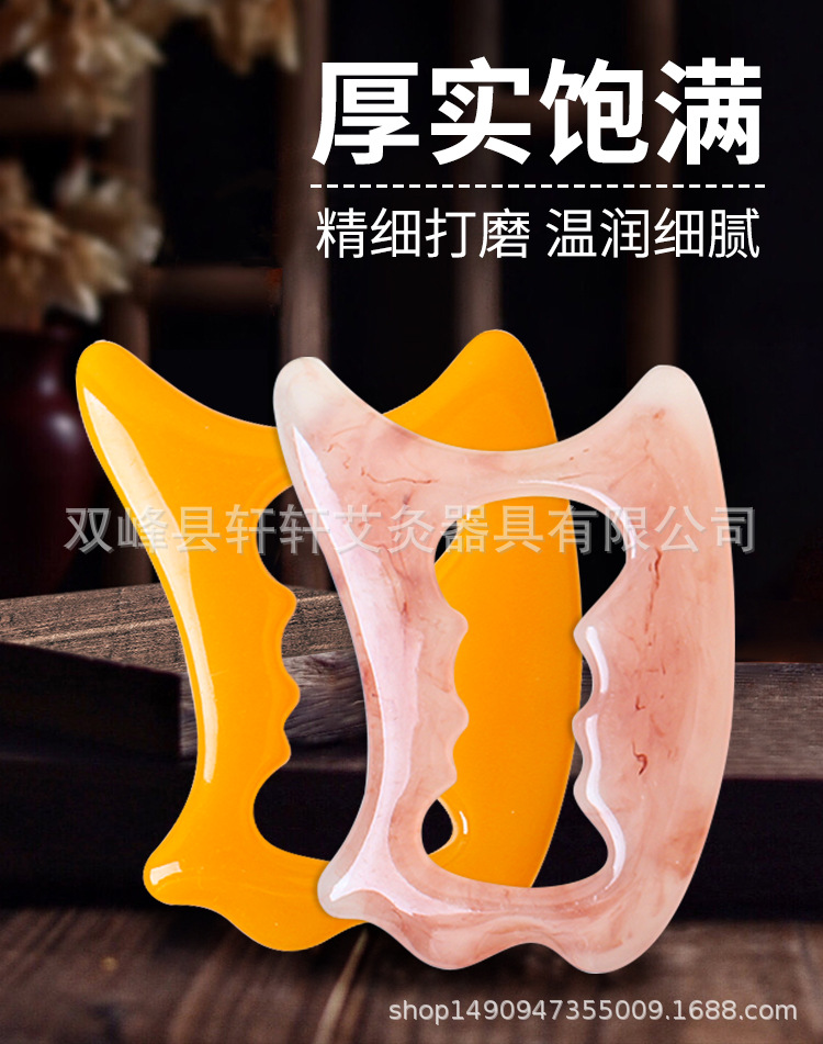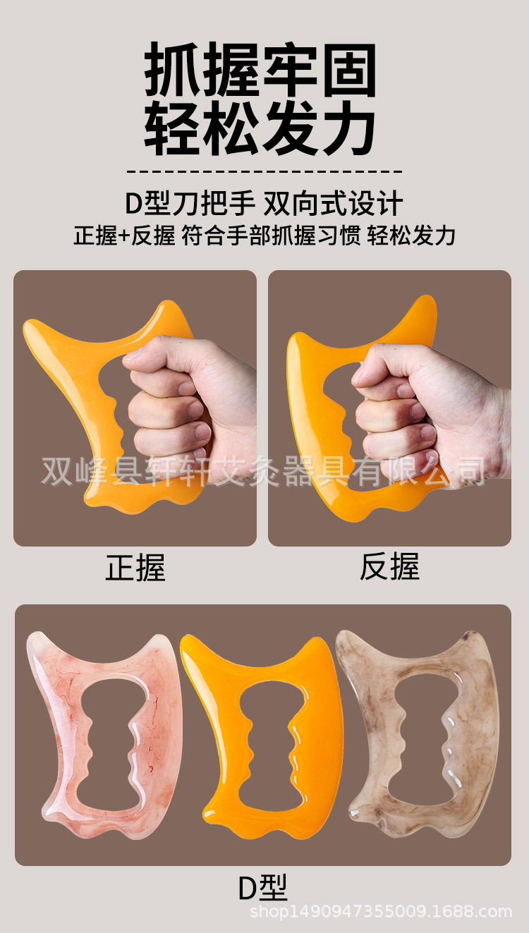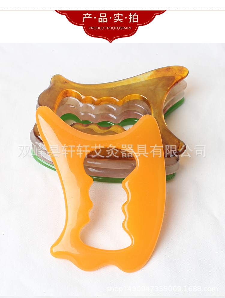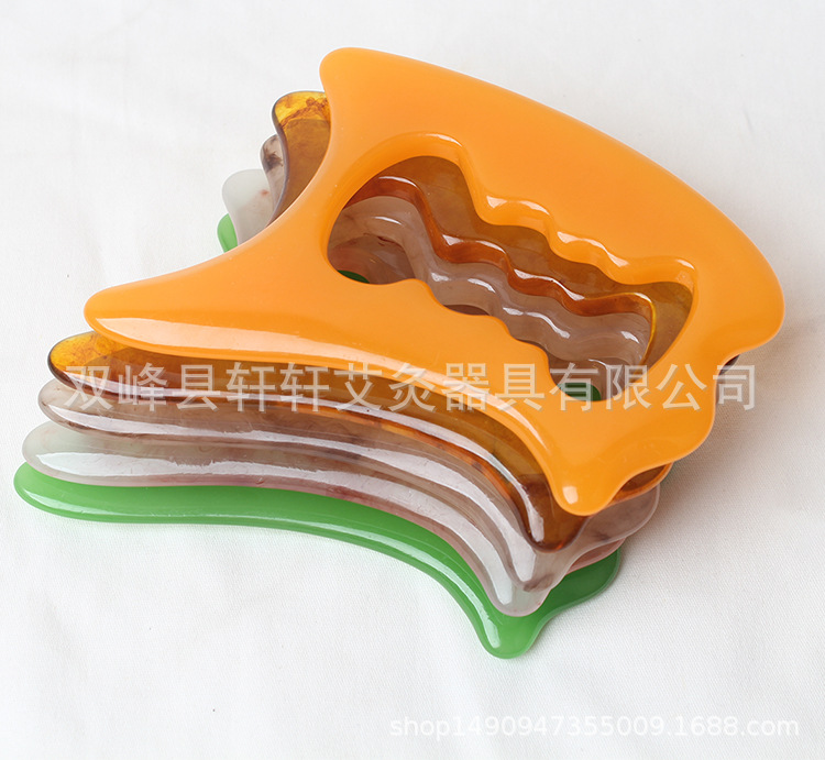 Пластини у формі серця, рибки, лапки гусака гусака, півмісяця без гострих кутів ідеально підходять для масування зон носа та губ, ретельного опрацювання контуру обличчя. Для тіла підійдуть скребки у формі серця або лопатки. Масувати голову можна за допомогою невеликих чотирикутних шкребків або гребеня. Середнього розміру прямокутні або квадратні інструменти — універсальні, для загального масажу. Масажер у формі палички призначений для акупунктурного впливу. Шкребок «ложка» зручно використовувати для масажу стоп.