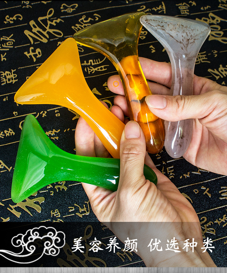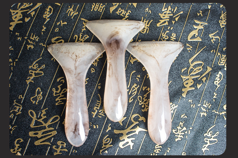 Пластини у формі серця, рибки, лапки гусака гусака, півмісяця без гострих кутів ідеально підходять для масування зон носа та губ, ретельного опрацювання контуру обличчя. Для тіла підійдуть скребки у формі серця або лопатки. Масувати голову можна за допомогою невеликих чотирикутних шкребків або гребеня. Середнього розміру прямокутні або квадратні інструменти — універсальні, для загального масажу. Масажер у формі палички призначений для акупунктурного впливу. Шкребок «ложка» зручно використовувати для масажу стоп.