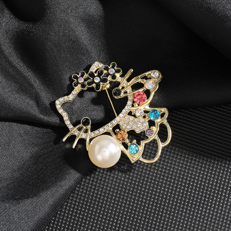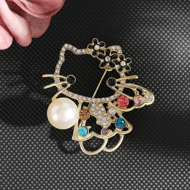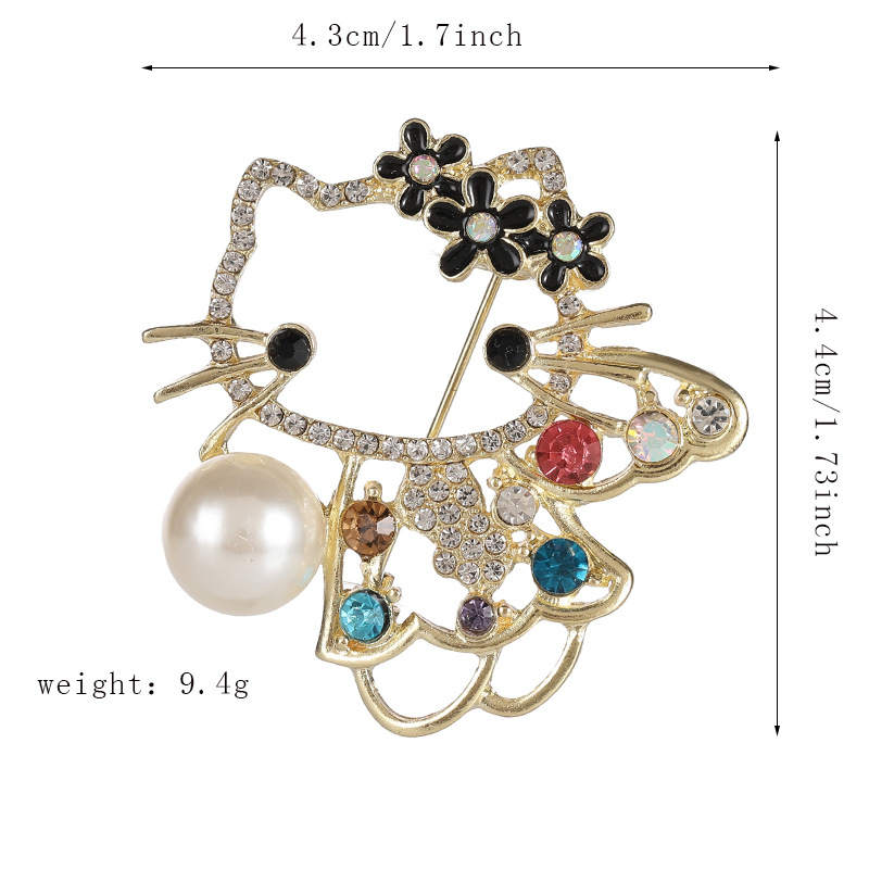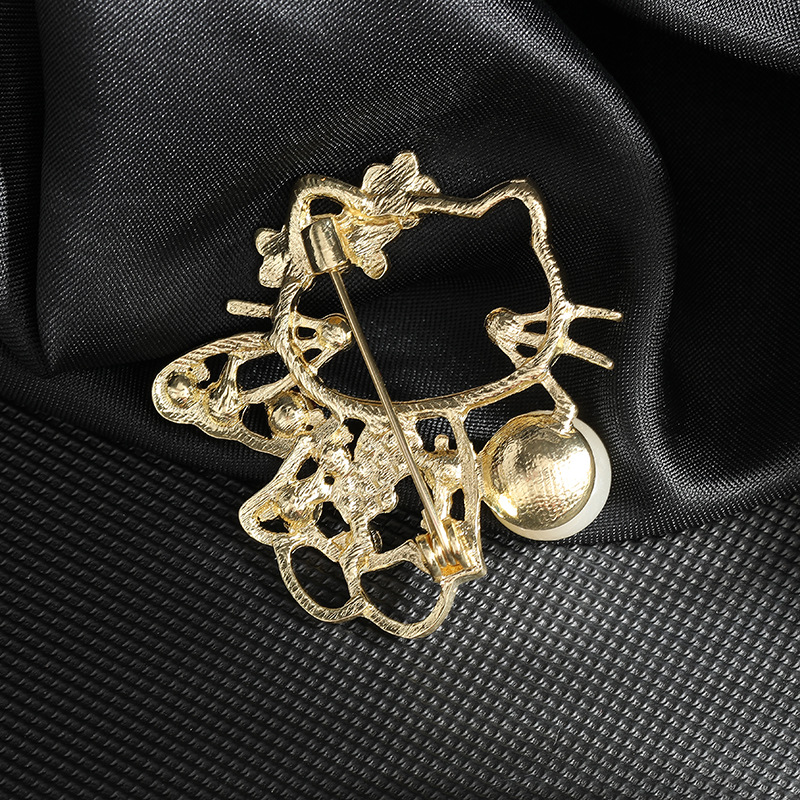 Брошка значок Хеллоу Кітті з перлиною, Hello Kitty 4х4 см Колір золото сплав стрази, мультяшна брошка