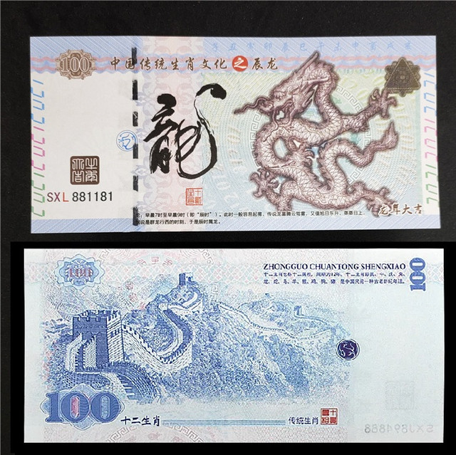 Видатні особливості: Сувенірна банкнота номіналом 100 мембран Китаю «Знак зодіаку». являє собою сувенірну банкноту, що не має номіналу в обігу. На додаток до захисної стрічки, банкнота також може світитися УФ-випромінюванням під фіолетовим світлом, відкриваючи унікальні та цікаві підводні світні зображення.