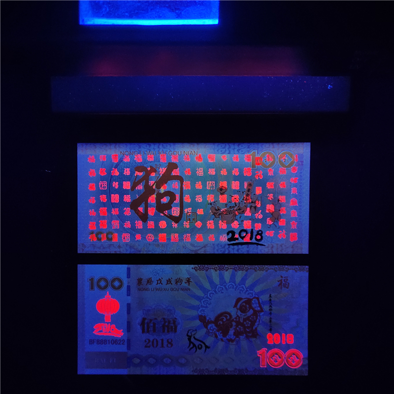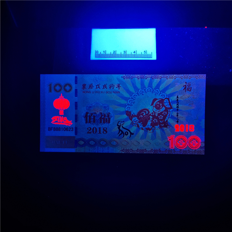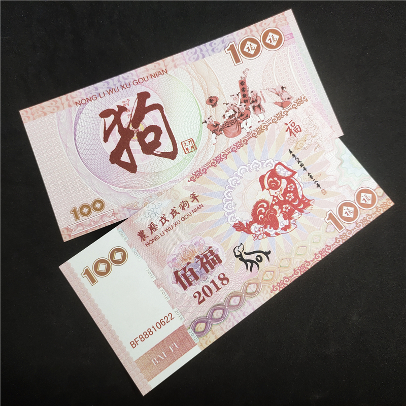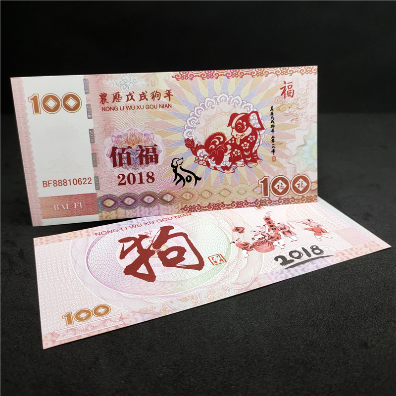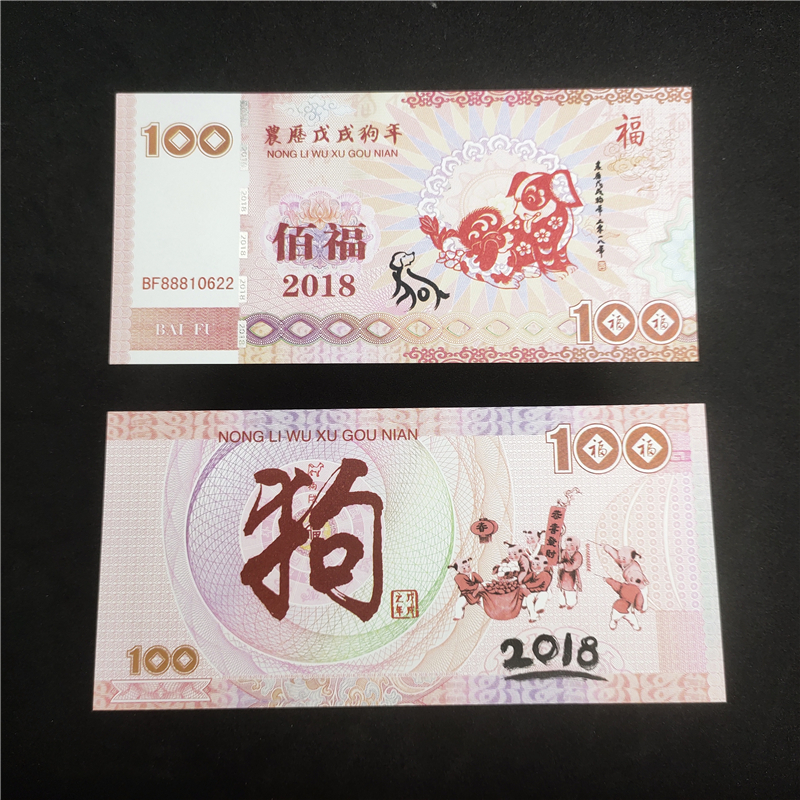Видатні особливості: Сувенірна банкнота номіналом 100 банкнот Китаю «Знак зодіаку Собака» 2018 року. являє собою сувенірну банкноту, що не має номіналу в обігу. На додаток до захисної стрічки, банкнота також може світитися УФ-випромінюванням під фіолетовим світлом, відкриваючи унікальні та цікаві підводні світні зображення.