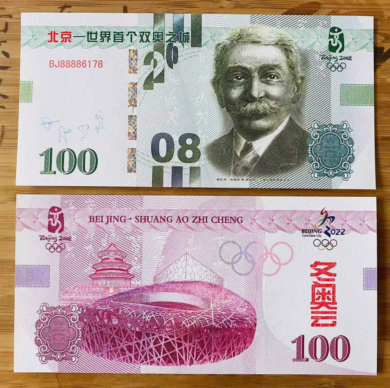 Банкнота Пам'ятна Флуоресцентна Кубертен Олімпійські ігри 2008 року в Бейдгі, колекційна.