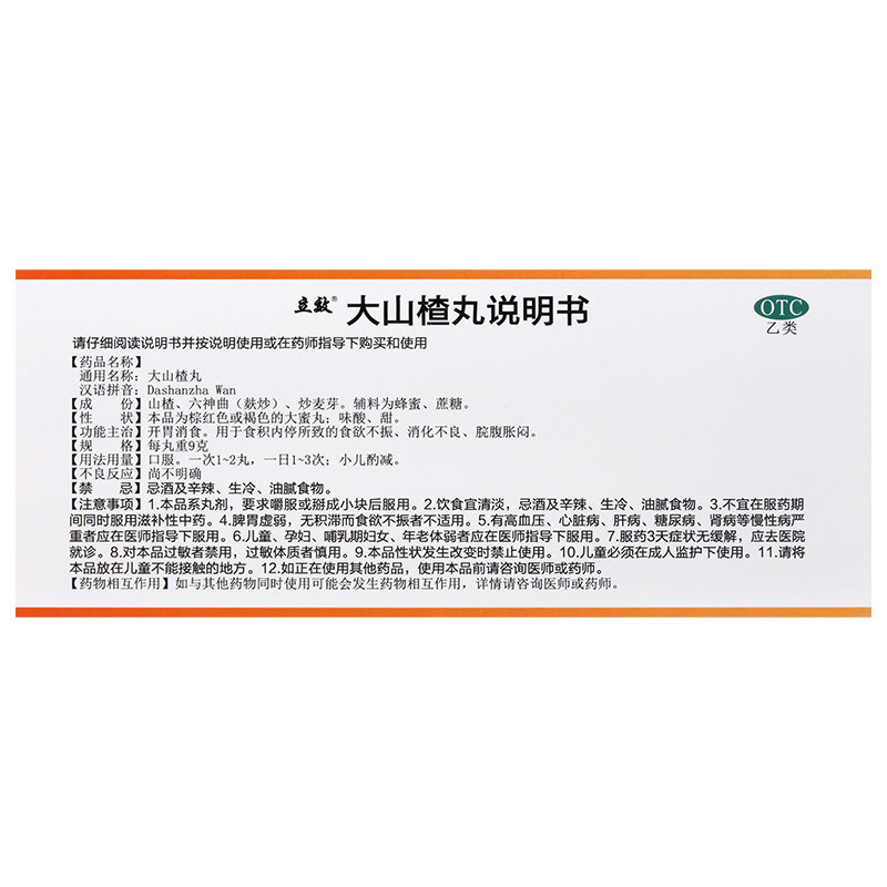 Склад: плоди глоду (shan zha), лікарські дріжджі (liu shen qu), обсмажені сходинки пишини (shao mai ya), мед (feng mi).