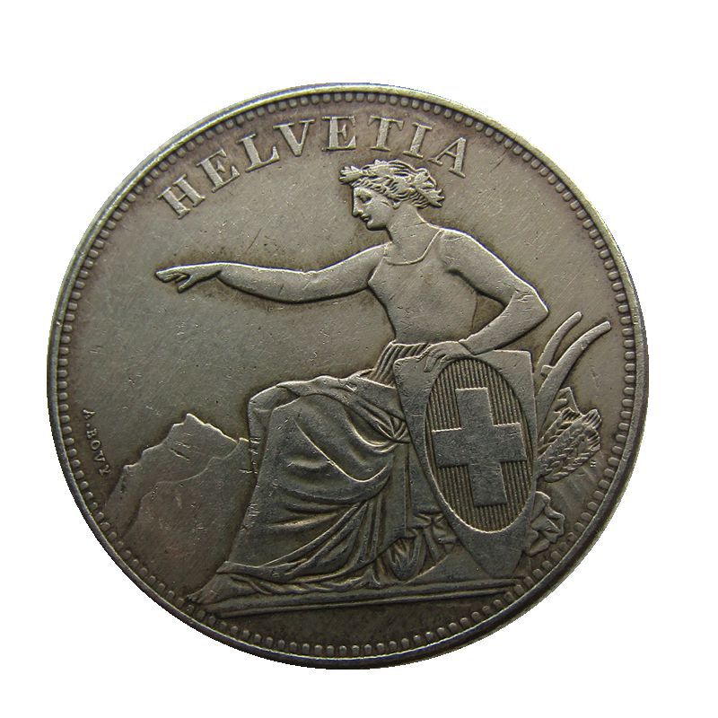 Конституція Швейцарії, взята 1848 року, встановлювала виняткове право федерального уряду на чеканку монети. 7 травня 1850 року був прийнятий федеральний закон про чоканку монет, у тому ж році начата чеканка швейцарських монет, зокрема монет у п'ятьбунів. Модель монети типу «Сидіюча Гельвеція» виготовив гравець Антуан Бови (Жіноча) за ескізомndisnass Фіша (Арау). Срібні монети цього типу чокали до 1874 року.