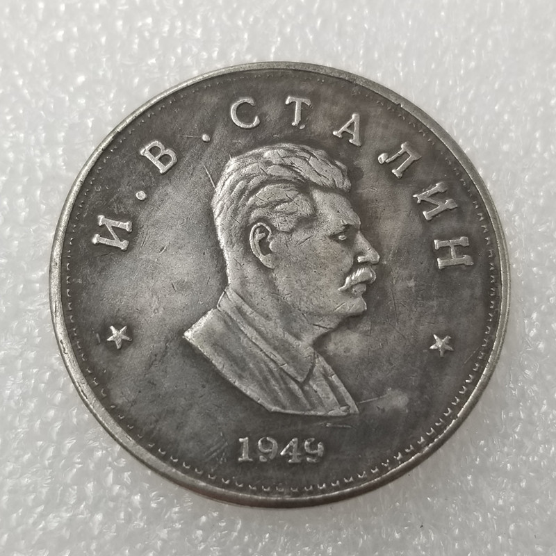 Пробна монета СРСР 1 рубель 1949 року На лицьовій стороні профільне зображення Сталіна внизу рік випуску та по колу напис-І.В. СТАЛІН, на зворотному боці в центрі панорами Кремля, вгорі державний герб СРСР по колу напис 81 РУБЛЬ СРСР. Пропонуємо Вам придбати якісну сувен монети СРСР 1 рубль 1949 року