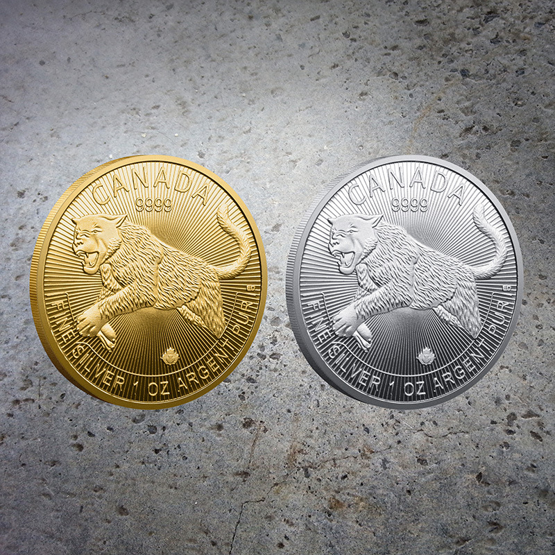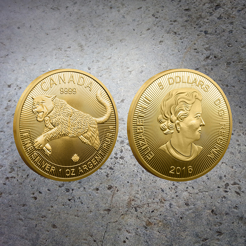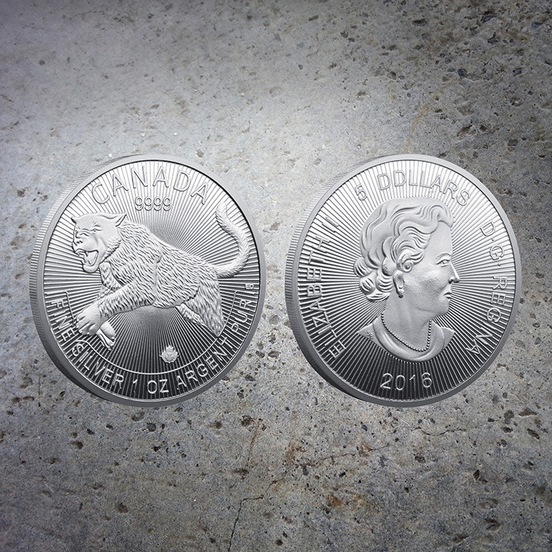 Срібна монета «Канадський кугуар» 2016 року вагою 1 унція стала першою монетою із серії з чотирьох монет «Канадський хижак» Королівського канадського монетного двору. На монеті є мікрогравований знак монетного двору у формі кленового листа для підвищення безпеки. На реверсі монети зображено зображення пуми, що стрибає до своєї видобутку, розроблене канадською художницею Емілі Дамстра. На аверсі кожної монети зображений портрет її Величності Королеви Єлизавети II.