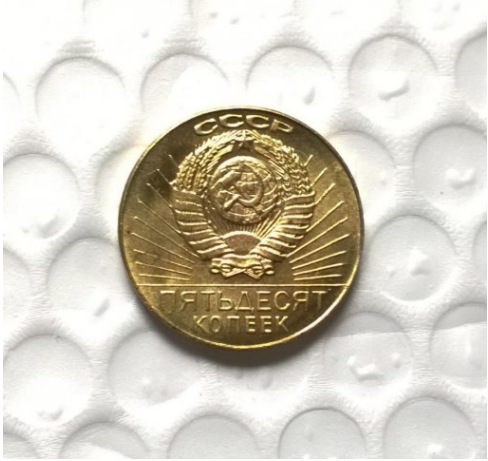 Рідка пам'ятна монета СРСР номіналом 50 копеек, відчеплена на честь 50 літнього ювілею Радянської влади (1917- 1967) На лицьовій стороні монети зображення В.І. Леніна, внизу роки 1917 - 1967. На зворотному боці зображений у сонячних променях державний герб СРСР, перев'язаний стрічками. Під горизонтальною рисою вказаний номінал монети П'ЯТИДІЙАТ КОПЕЕК
