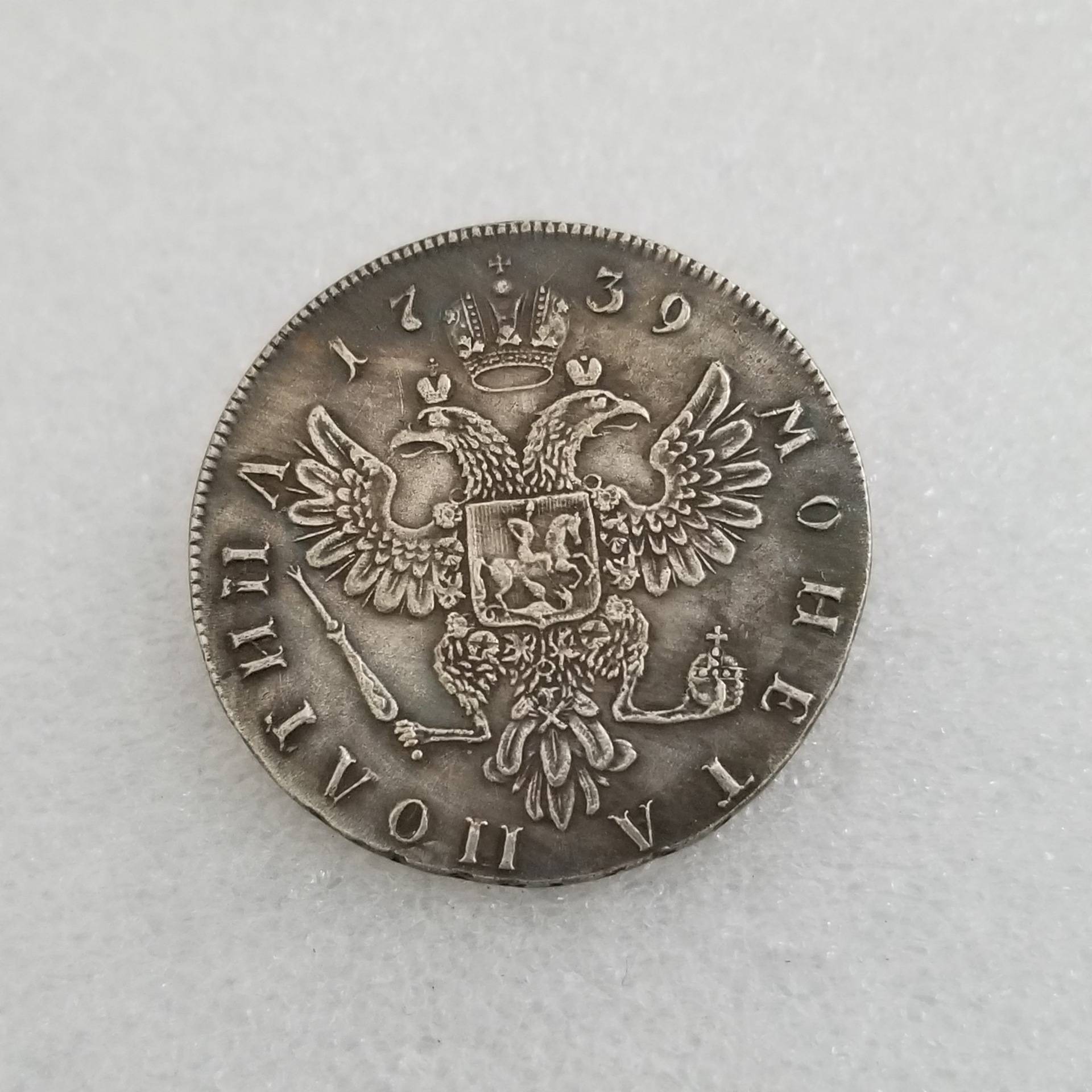 Рубль 1739 року (період імператриці Анни Івановни) чеканав зі срібла 802 проби. Санкт-Петербурзького монетного двору.