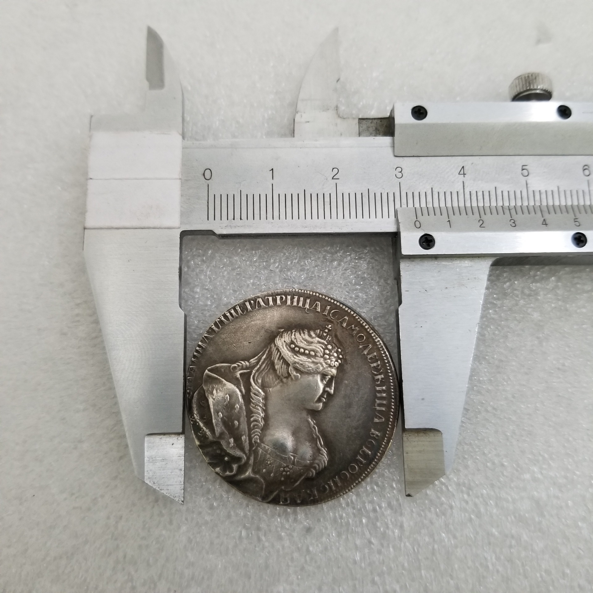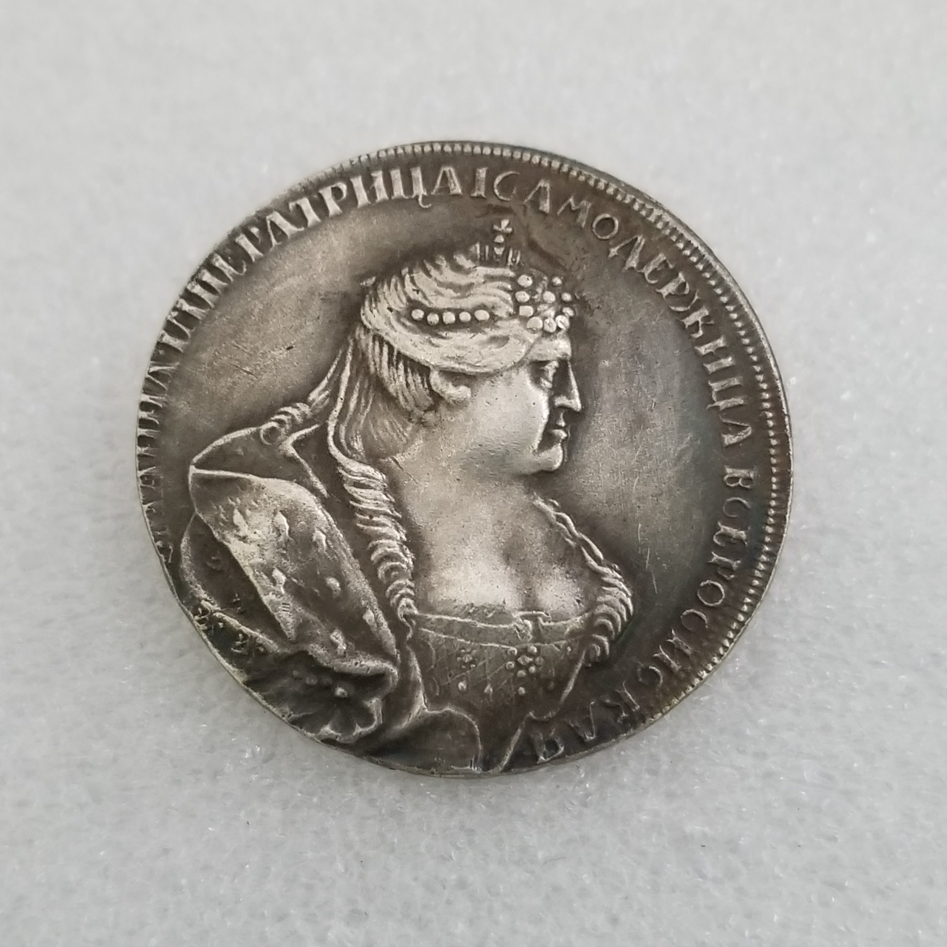 Представлена репродукція монети виготовлена методом чекана з немагнітного металу з покриттям срібла високої проби. Монета має благородний вигляд вікової старовини.