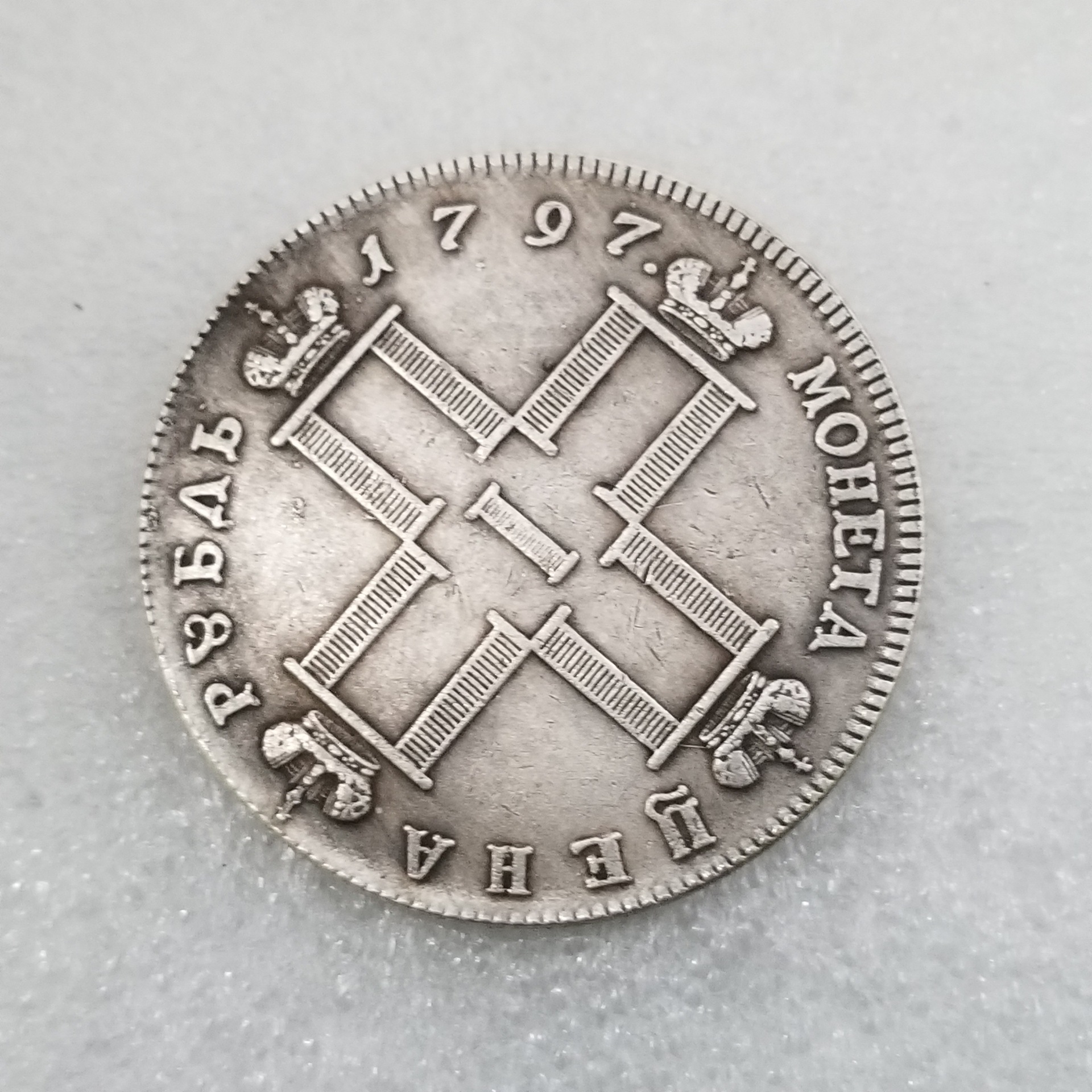 У центрі зображена хрещата монограма, що складається з 4 букв «П», увінчаних імператорськими коронами та римської цифри «I» в центрі. Уздовж канта круговий напис: «МОНЕТА ЦЕНА РУБЛЬ 1797», розділена на 4 частини імператорськими коронами.