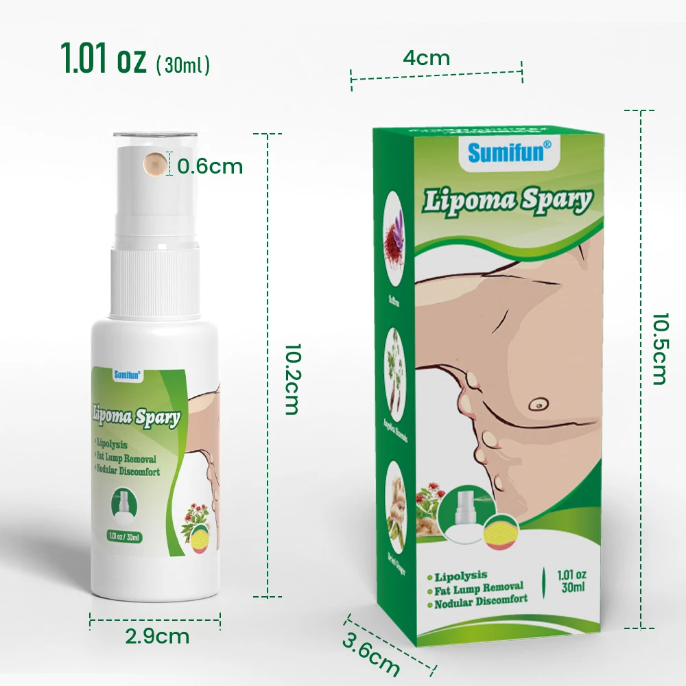 Спрей Sumifun Lipoma Spray розроблений для зручного та дбайливого догляду за шкірою. Його інноваційна формула допомагає зменшити ліпоми та жировики, забезпечуючи ефективний вплив без неприємних відчуттів. Компактний і простий у використанні формат робить засіб ідеальним вибором для регулярного застосування.