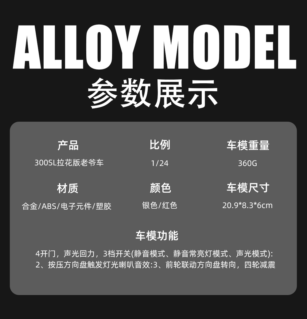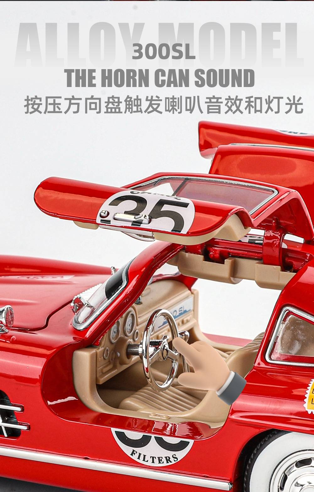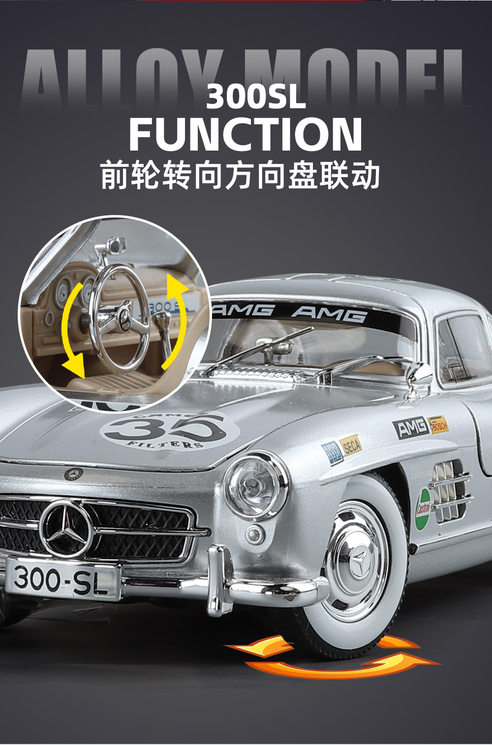 Придбайте цей приголомшливий Mercedes 300 SL у масштабі 1:24! Завдяки світловим і звуковим ефектам і робочим деталям цей автомобіль стане ідеальним подарунком для будь-якого автолюбителя. Не пропустіть можливість поповнити їм свою колекцію. Замовте зараз і насолодіться якістю й реалістичністю цього автомобіля!