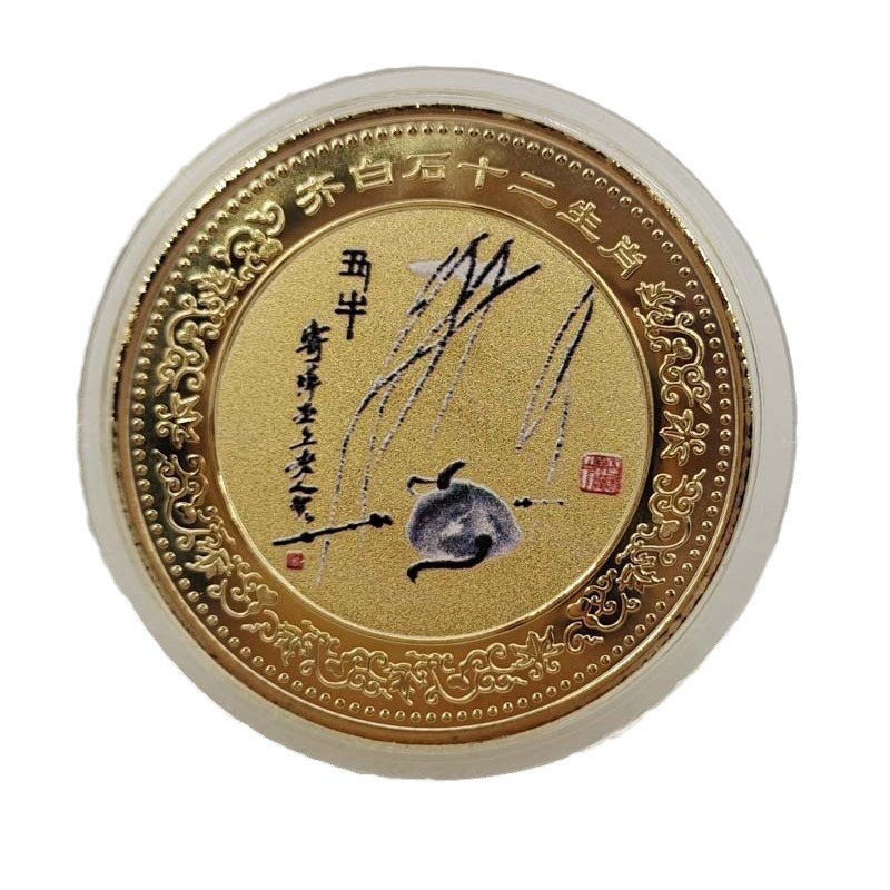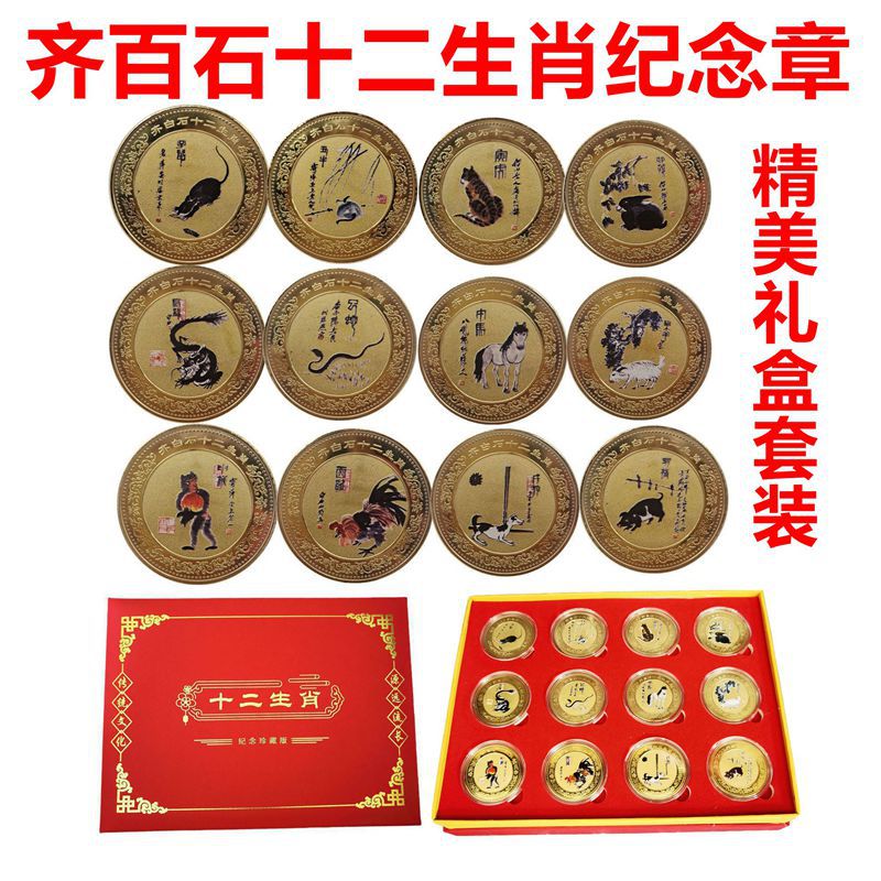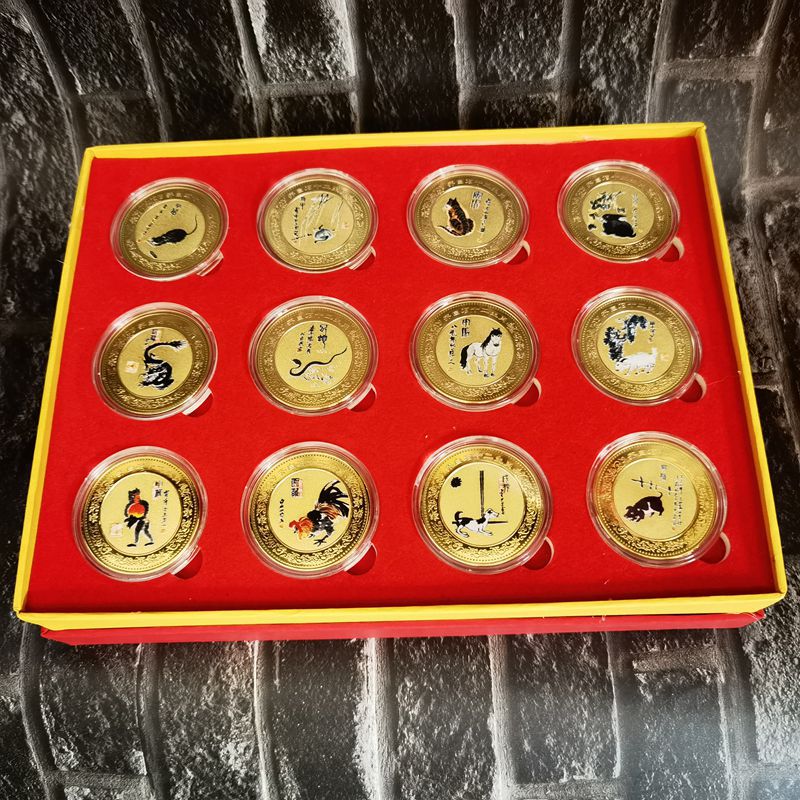 Подарунковий набір з 12 пам'ятних монет медалей Зодіакі Зодіака стиль Ци Байші. 40*1.5мм Голд (у коробці)Немає в наявності