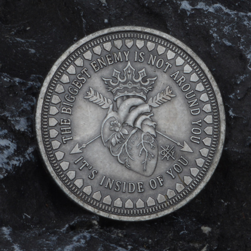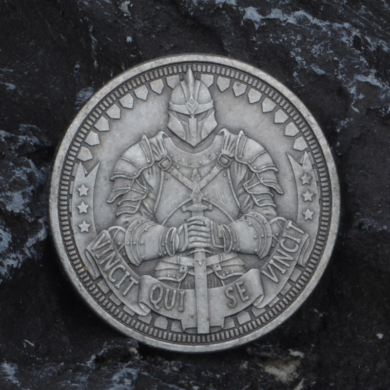 Vincit Qui Se Vincit — Перемагає той, хто перемагає самого себе. Ця монета є нагадуванням про те, що людина, яка долала свої слабкості або вади, здатна контролювати свої емоції й дії, перемагає в найважливішій битві життя.