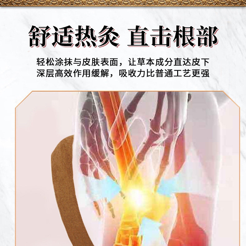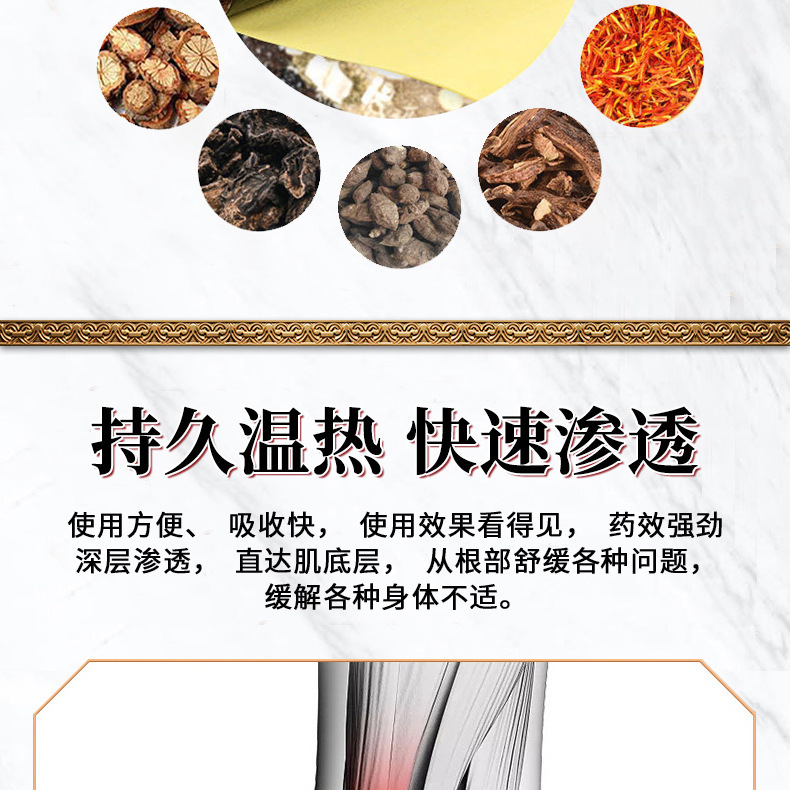 Основні компоненти:корінь аконіту, пальник великолиста, сафлор, дягель китайський, борнеол, порошок магніту, насичений інфрачервоний порошок та ін.