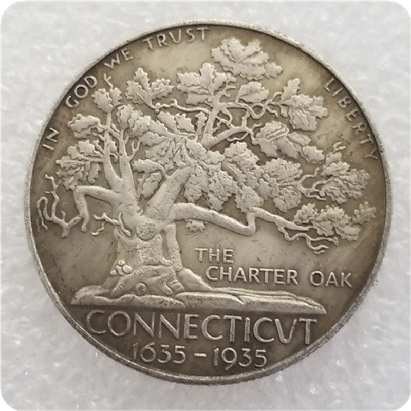 Випуск пам'ятної монети був схвалений на честь 300-річчя заснування Contoryntory. Дизайн півдолара 1935 Connecticut Tercentenary Half Dollar був досить яскравим у стилі ар-деко із зображенням дуба та білого орлана. Знаменитий дуб Charter Oak зображений на тому, що зазвичай вважається аверсом монети. Саме тут колоністи зберігали свою королівську хартію, коли король Яков II намагався її конфіскувати. Зображення дерева ґрунтується на картині Чарльза ДеВольфа, що зберігається в історичному суспільстві Contory. Пропорції листя збільшені для драматичного ефекту.