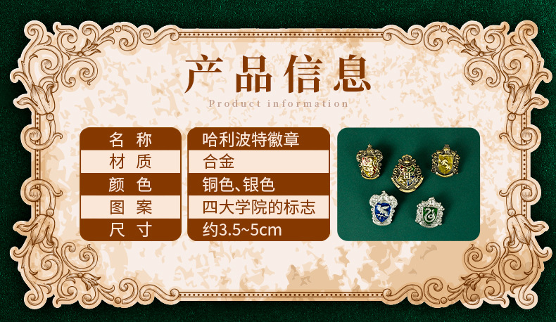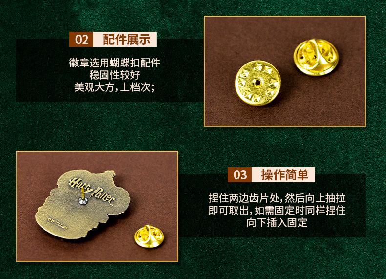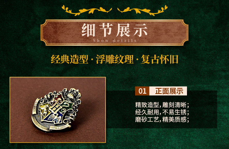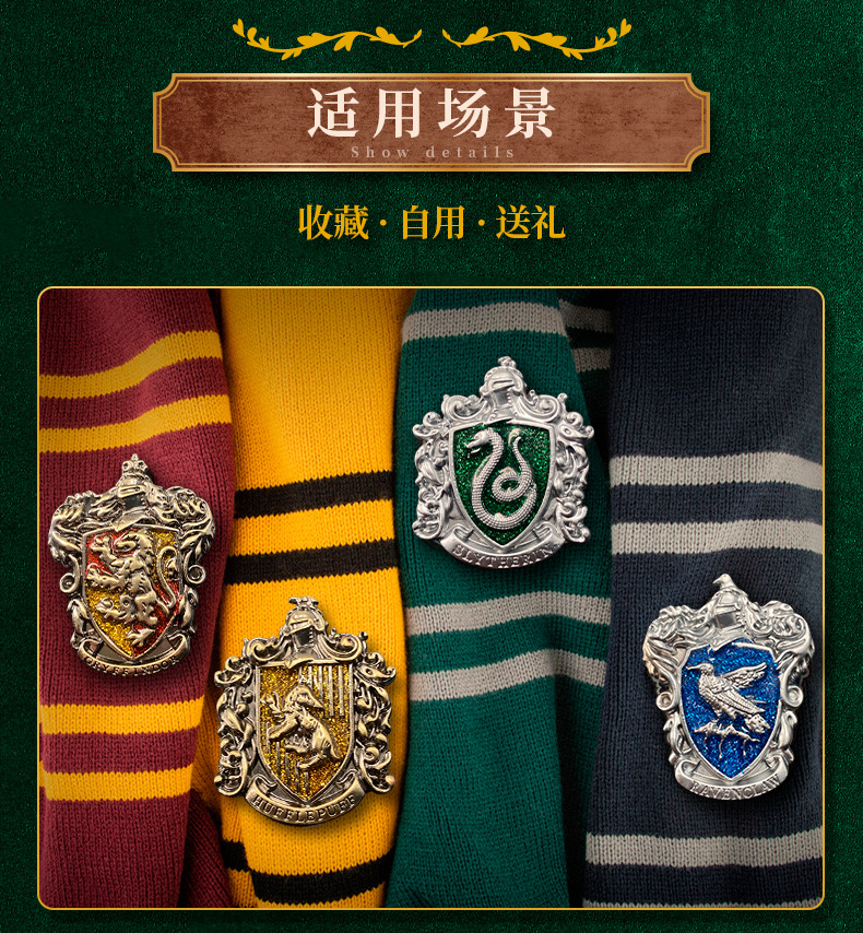 Значки гербів Гоґвортса — школи, що навчає чарівництва та магії, представляють факультети, з назвами на честь засновників навчального закладу. Кожен із учнівковзна належить до певного "дого", аксесуар допоможе користувачеві відчути свою належність до магії.