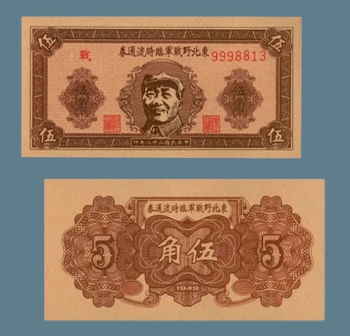 Білет тимчасового поводження Північно-Східної польової армії номіналом 5 цент Монета Китайської Республіки «38 років антияпонської війни» Банкнота 1949 року з портретом Мао Цзедура