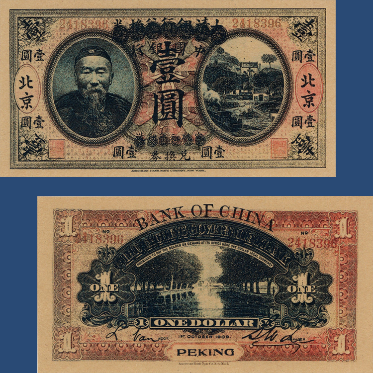 Банк Китаю 1 юань портрет Лі Хунчжана, перший рік правління Сюаньйон (1908-1912 роки) останнього імператора держави Цин 1636–1911 гг), Бейдгментамісна банкнота — ранній сертифікат обміну 1909 гроші банкноти