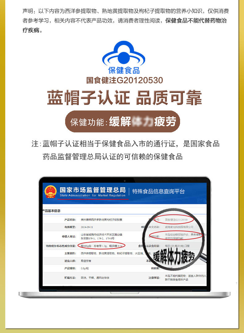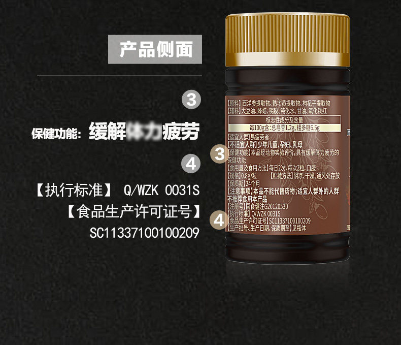 Основні інгредієнти: екстракт американського женьшеню, екстракт Rehmannia Glutinosa, екстракт лайчі. Допоміжні речовини: олія соєва, віск бджолиний, желатин, гліцерин, вода очищена, заліза оксид червоний; в шкірних 100 г міститься: сапонінів усього 1,2 г, полісахариду сирого 6,5 г;