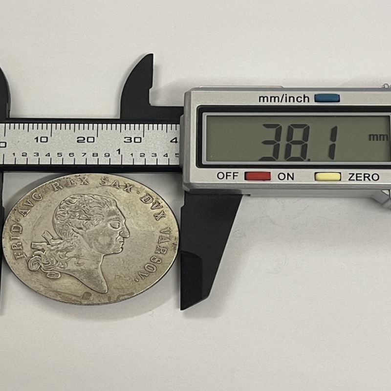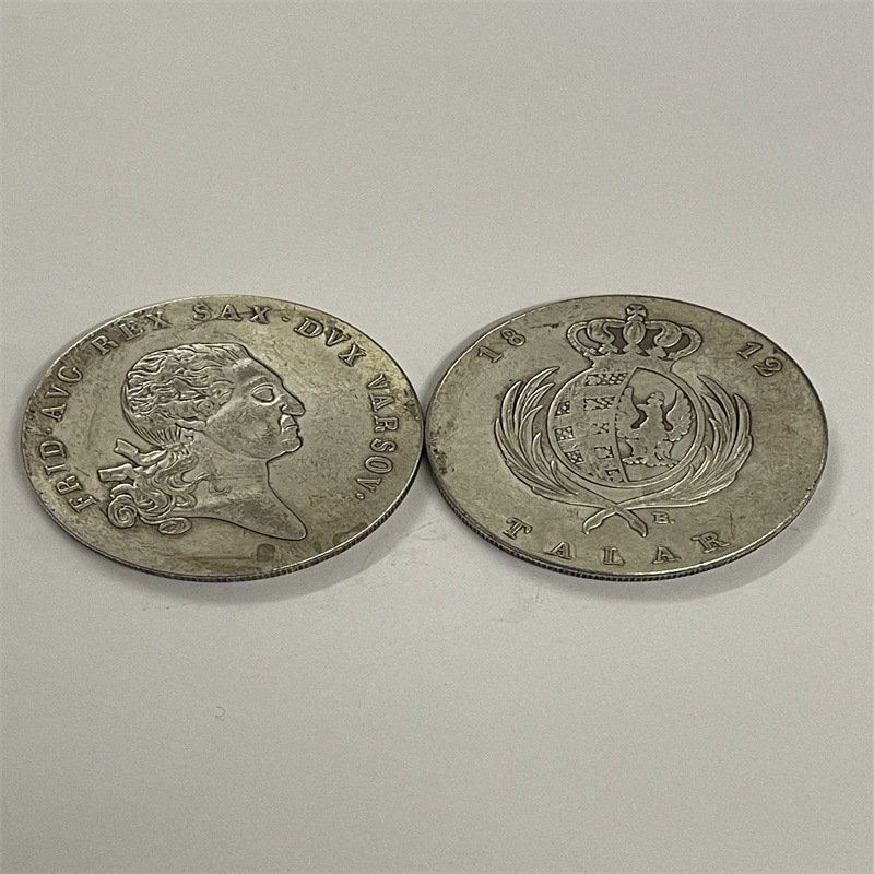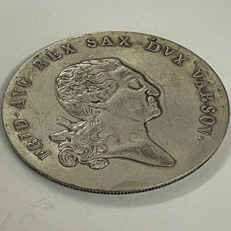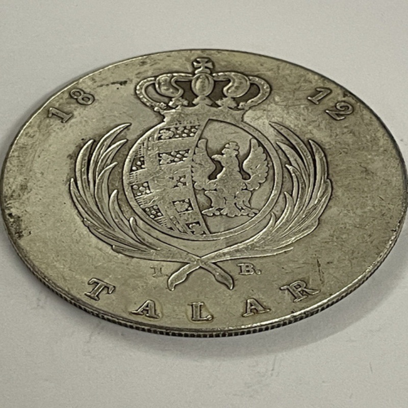 Срібна монета Сакосонії номіналом Талер 1812 року I.B (Варшавське князівство). На лицьовій стороні монети відчеплений профільний портрет короля Вірджиніяа Августа 1 праворуч, за окружністю напис: "FRID. AVG. REX SAX. DVX VARSOV". На зворотному боці зображений герб із короною, за обводом вказаний номінл і рік випуску монети: "TALAR 1812".