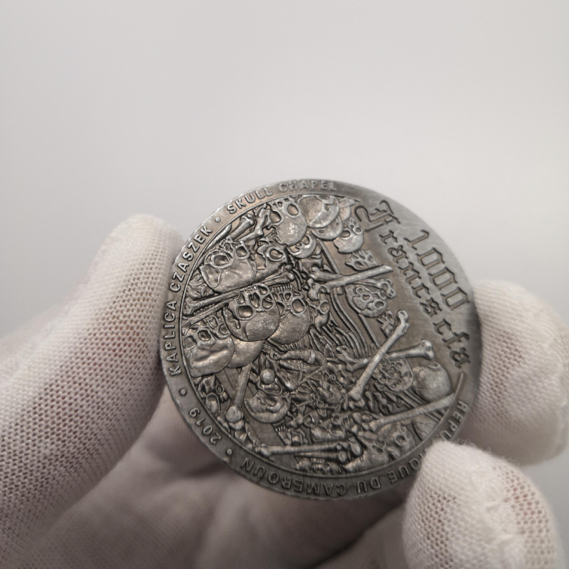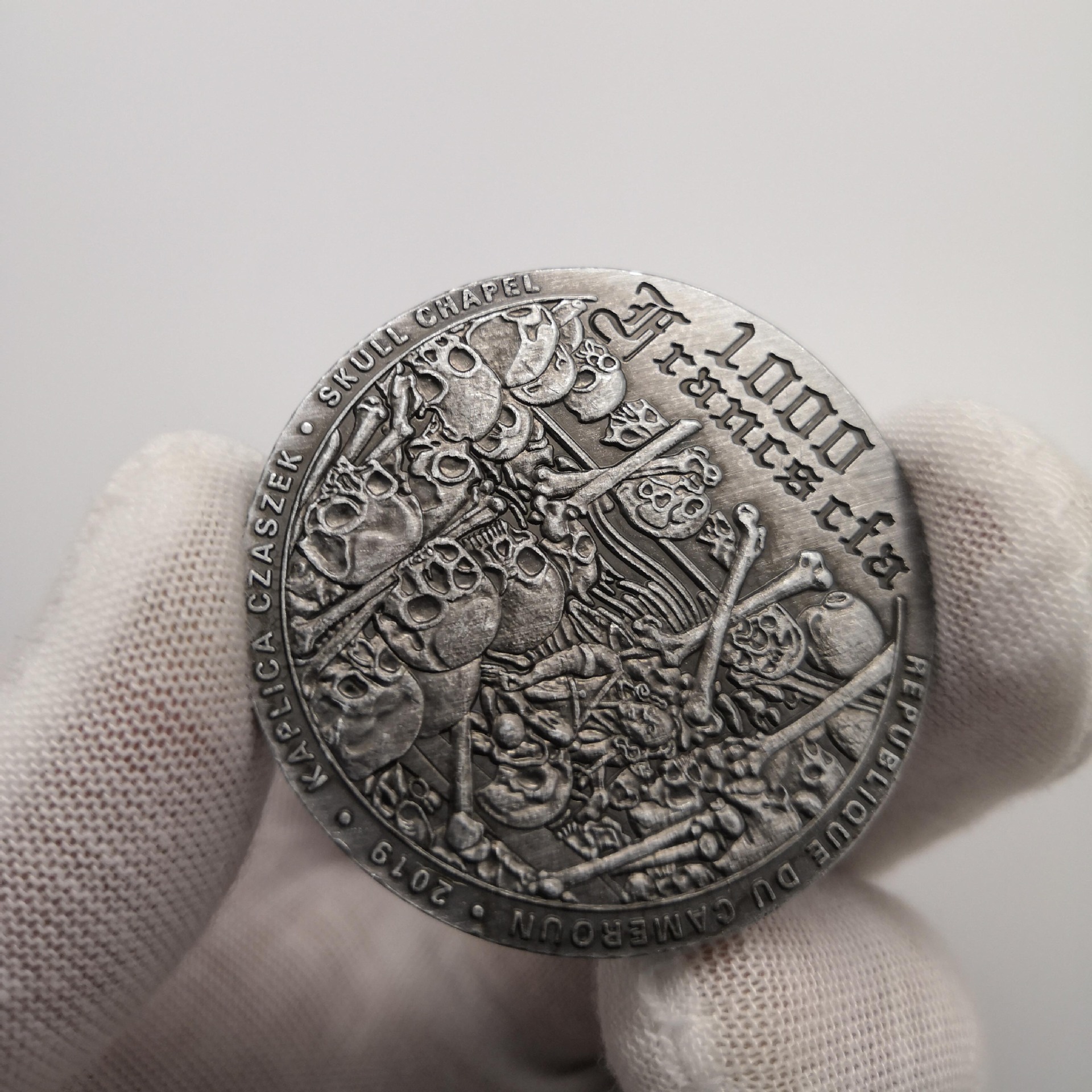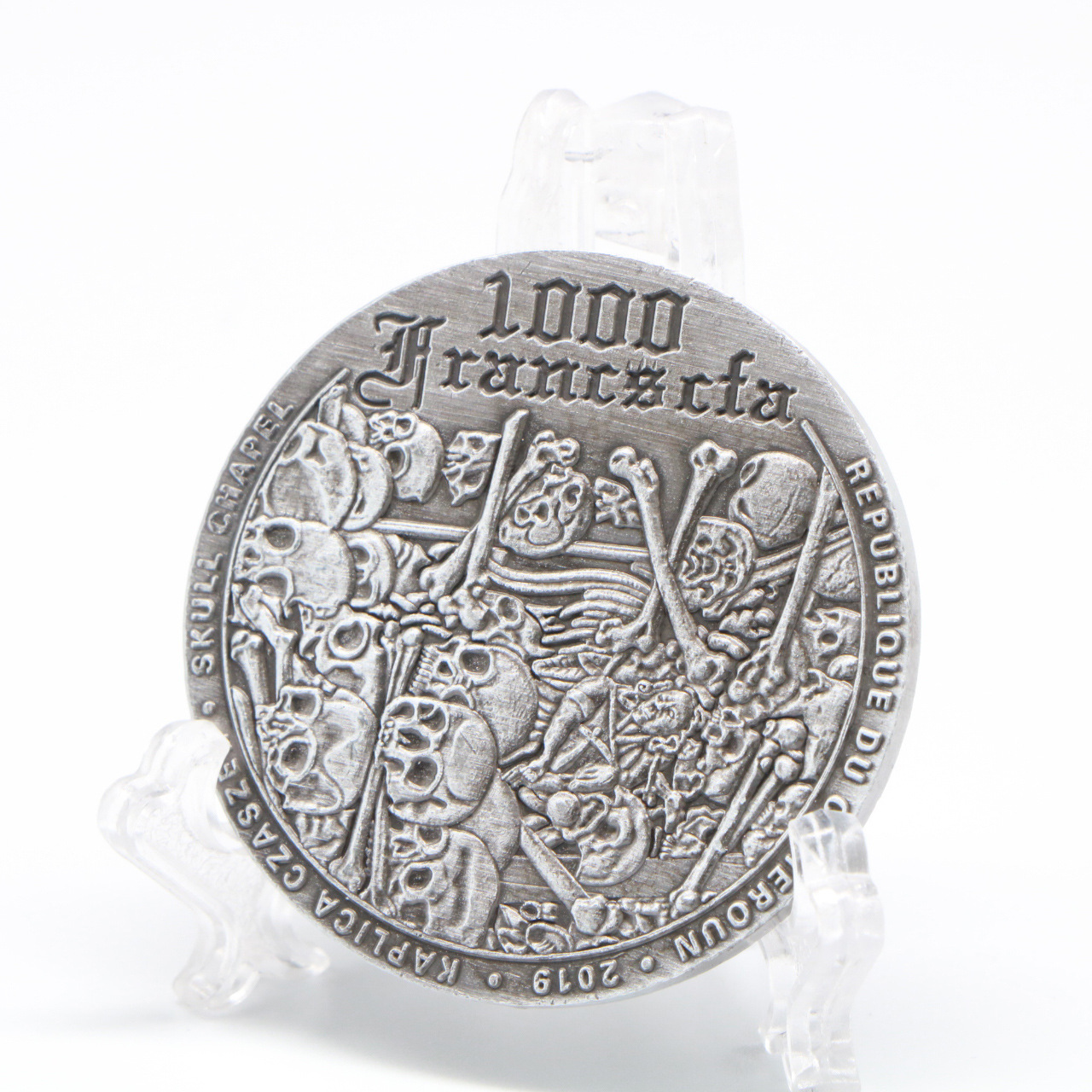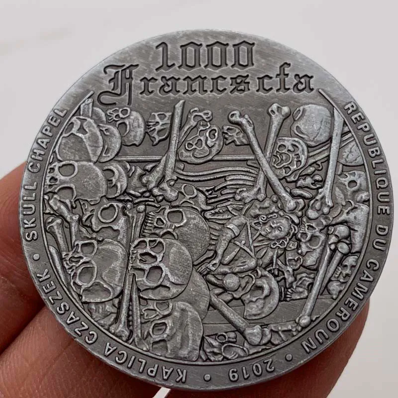 На реверсі монети зображена часнику Черепа. На аверсі монети інший різновид годинника та написів: "1000 Francs cfa" — номінал, "REPUBLIQUE DU CAMEROUN" — країна-емітент, "2019" — рік випуску, "KAPLICA CZASZEK" назва годинника на польській мові та "SKUL CHEL" — назва монети.