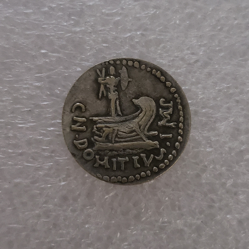 Монета римської республіки денарій, 41 рік до Р. Х. Гней Доміцій Агенобарб. Після вбивства Цезаря Агенобарб був відправлений на чолі флоту з 50 кораблів в Адріатичне море, де в морській битві зруйнував флот противника. За цю перемогу Агенобарб прийняв титул імператора та випустив монети. На лицьовій стороні профільне зображення імператора, уздовж зображення напис AHENOBAR, на зворотному боці прора корабля, увінчана трофеями та напис CN DOMITIVS IMP