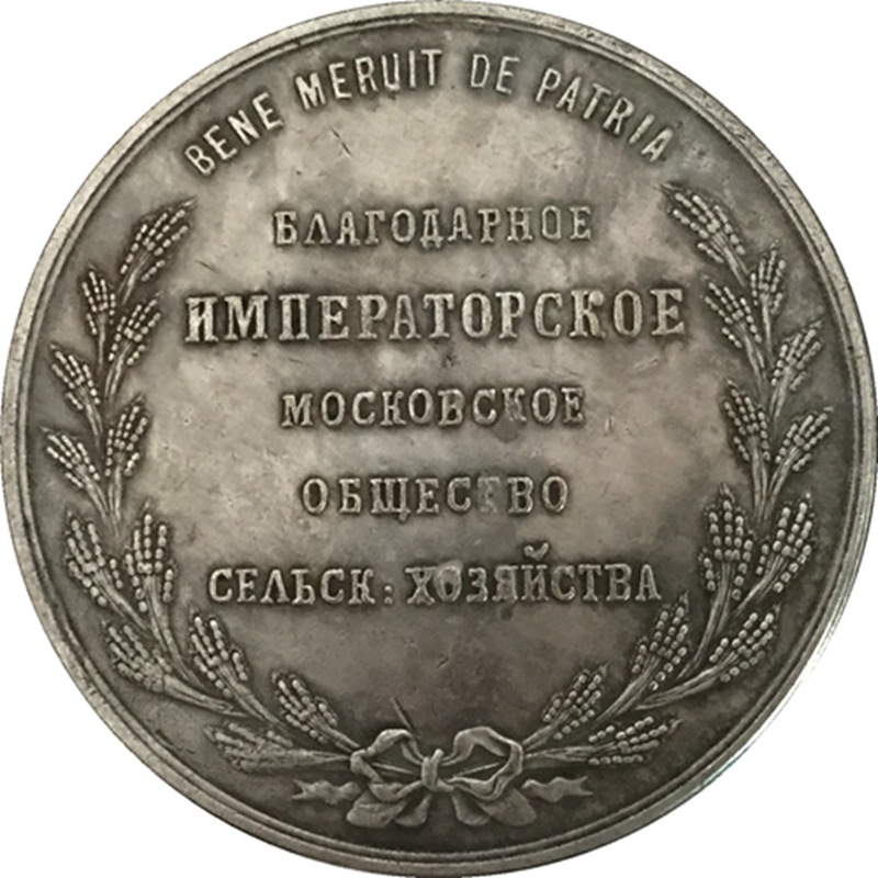 Медаль Імператорського Московського суспільства сільського господарства. СПБ монетний двір, 1820-е — 1830-е рр. Медальєр облич. ст. П.А.Лялін (на обрізі: П•ЛЯЛІН.). Срібло, 55,25 г. Диаметр 49,0 мм. Напис на об. ст. медалі вгорі: «BENE MERUIT DE PATRIA» (Оказував великі послуги Вітчиству).