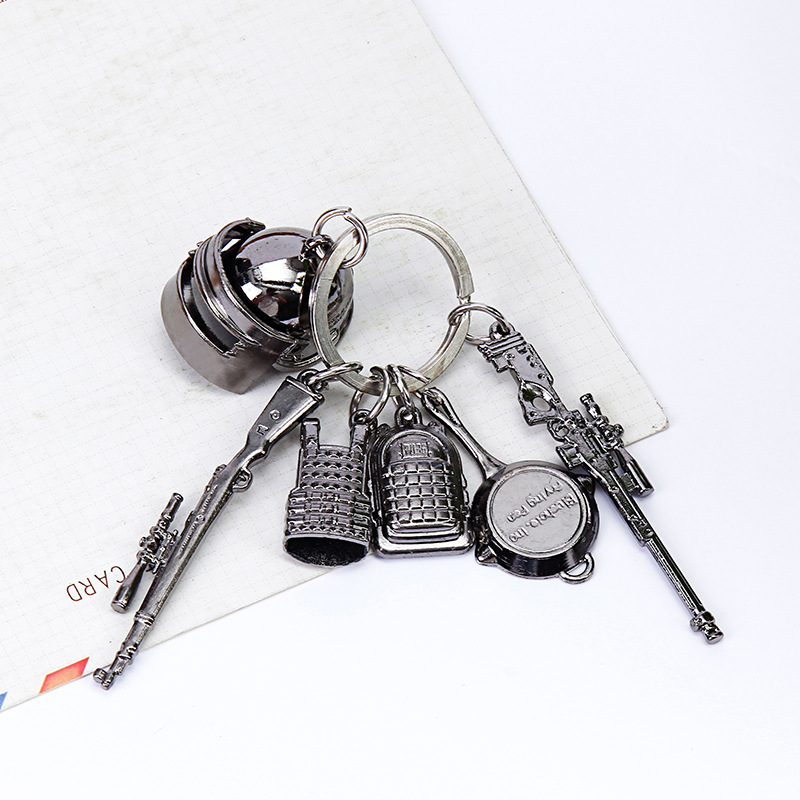 Брелок являє собою мініатюрний набір культових ігрових предметів із популярної гри PlayerUnknown's Battlegrounds (PUBG). До комплекту входять шолом, сковорідка, гвинтівки KAR98K і AWM, рюкзак і бронежилет — все, що потрібно для повного бойового спорядження справжнього бійця!