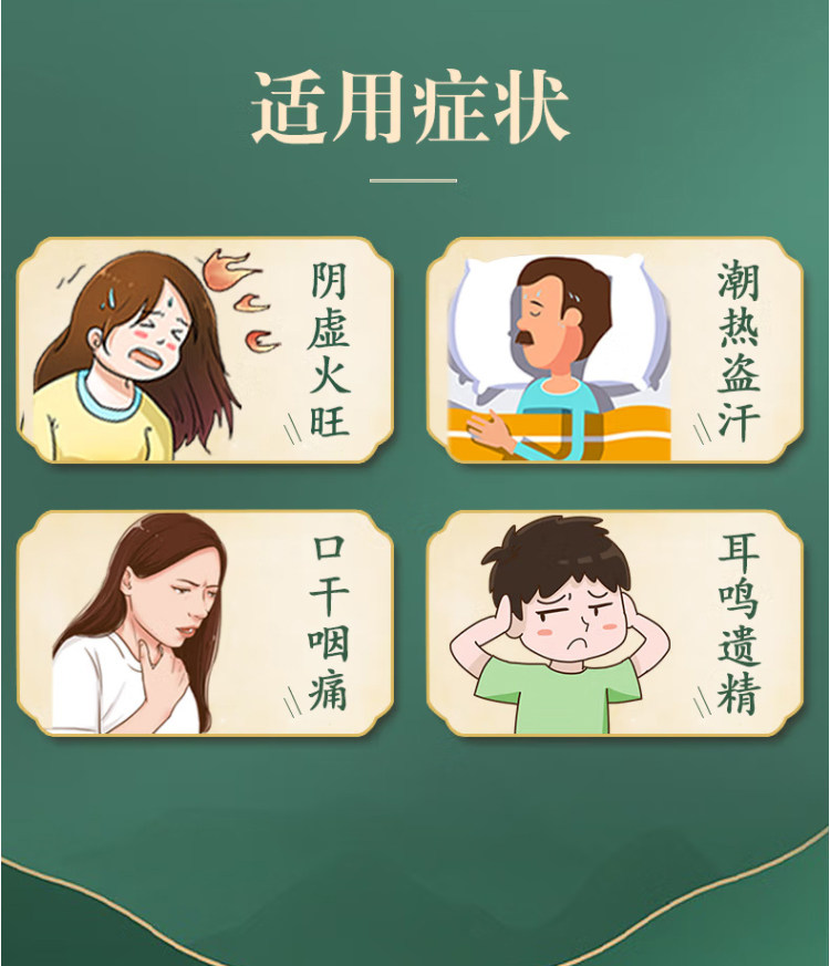 - Запаморочення, головний біль, шум у вухах, знижений слух, нечіткий зір, болючість і слабкість нижньої частини спини та колін, нічна пітливість, закінчення насіння, напади жару, відчуття жару в долонях і підошвах, спрага та сухість у роті: дефіцит Інь Печиво та нирок - Відчуття печіння в кістках, напади жару, дратівливість: Світіння через дефіцит Інь |