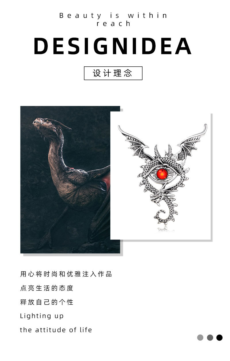 Брошка у формі очі дракона часто асоціюється із захистом, мудрістю, силою й гармонією, а також з інтуїцією й вдачею. У різних культур цей символ може мати різні значення, але загалом він символізує щось містичне та таємниче, пов'язане з могутність ічорним розвитком.