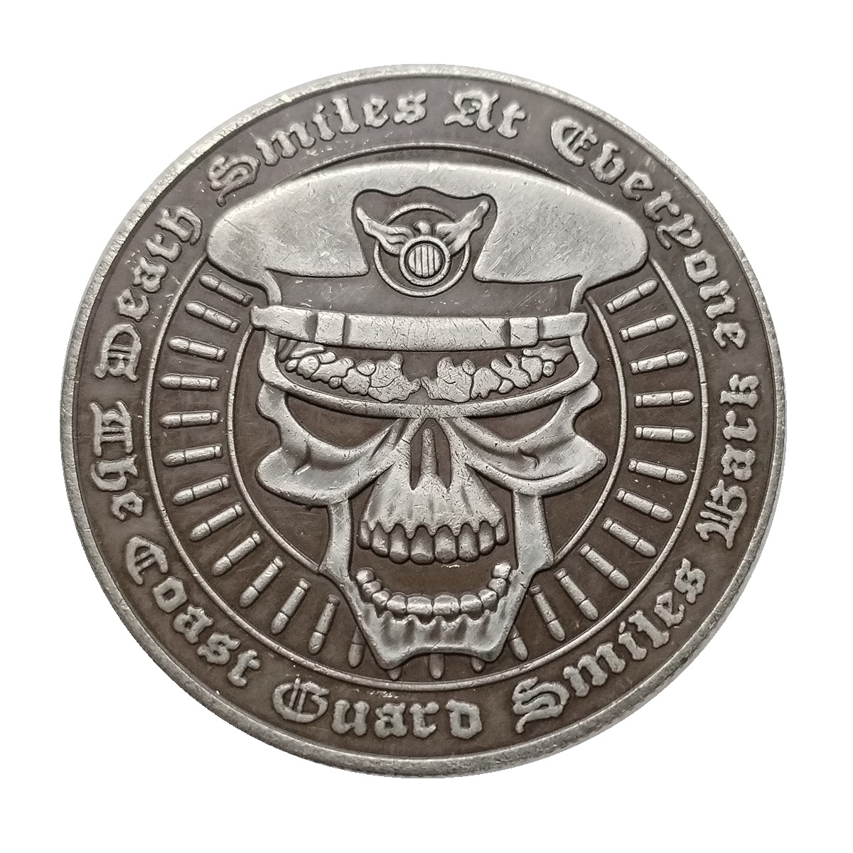 «Смерти усміхається всім... Берегова охорона усміхається у відповідь» — стверджується на цій грізній срібній монеті-звози. На лицьовій стороні монети зображений 3D-череп у формі берегової охорони, оточений кулями та чорним фоном. На зворотному боці монети зображений американський долоревий орел.