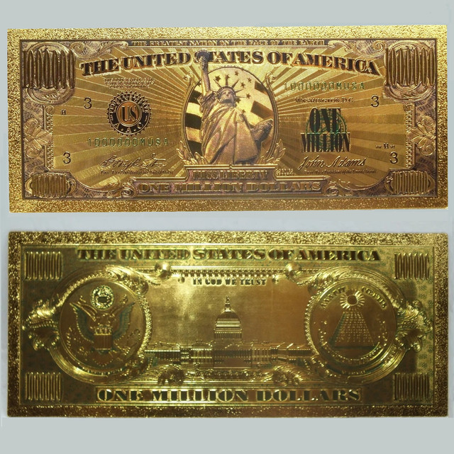 На лицьовій стороні банкноти, виготовленої в золотистому кольорі, зображена Статуя Свободи, а також написи "THE UNITED STATES OF AMERICA" і "ONE MILLION DOLLARS". Є також написи "WASHINGTON D.C". і "John Adams", а також серійний номер, який може варіюватися (наприклад, A17762000B на одній із таких банкнот).