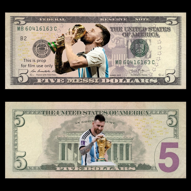 На зображенні представлена стилізована банкнота номіналом «П'ять доларів Месі» («Five Messi Dollars»), що імітує дизайн американського долара, але із зображенням Ліонеля Мессі та Кубка світу з футболу.