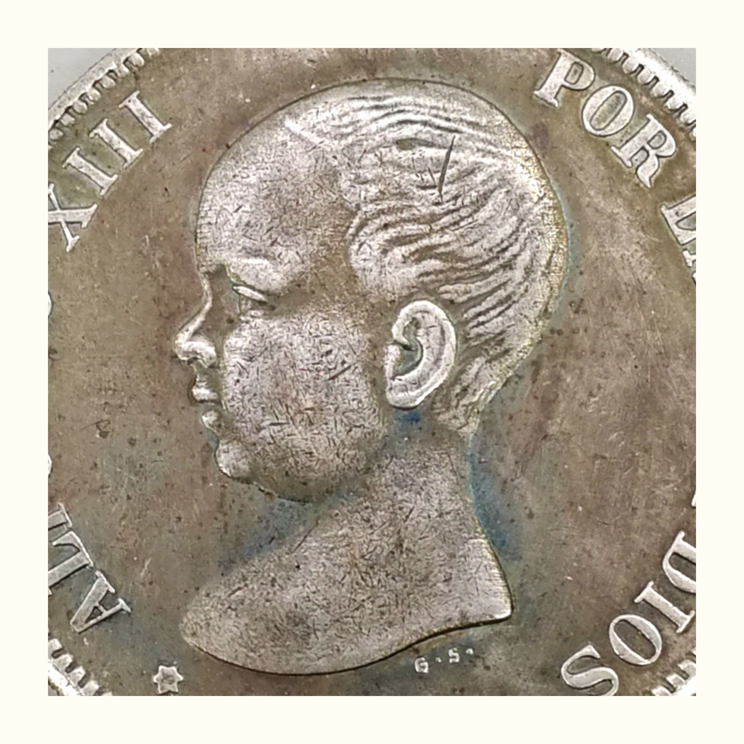 - Аверс: На аверсі монети зображений профіль юного короля Альфонсо XIII, що дивиться вправо. Навколо портрета розміщений напис "ALFONSO XIII POR LA G. DE DIOS" (Альфонсо XIII Милістю живого) і рік чеканки "1889".