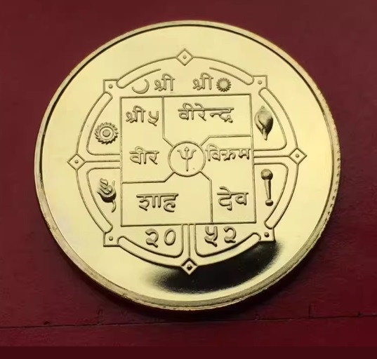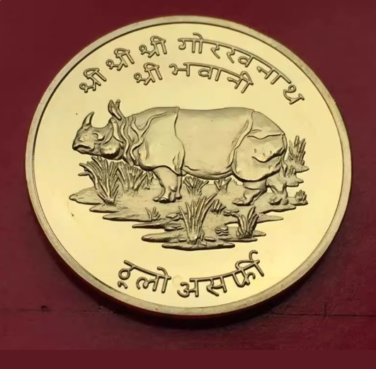 - Під зображенням носорога міститься текст: "| " (Тхуло Асарфі), що означає "Велика Асарфі" (Асарфі — історична назва золотої монети в Непалі).
