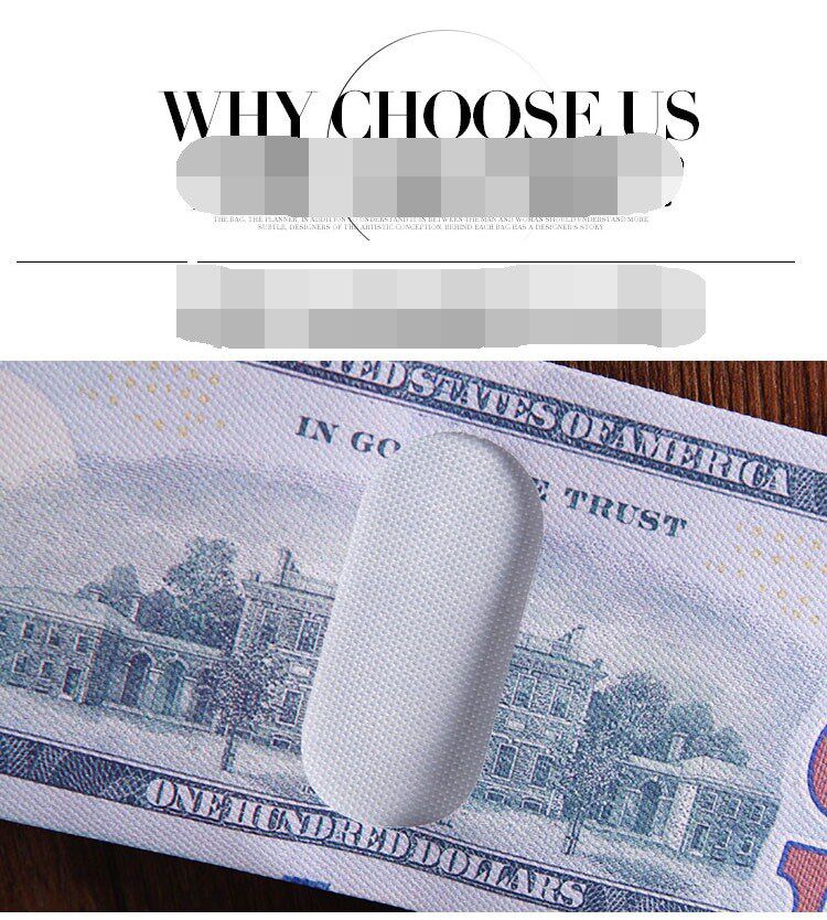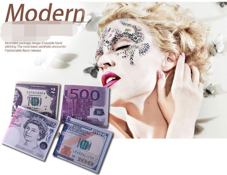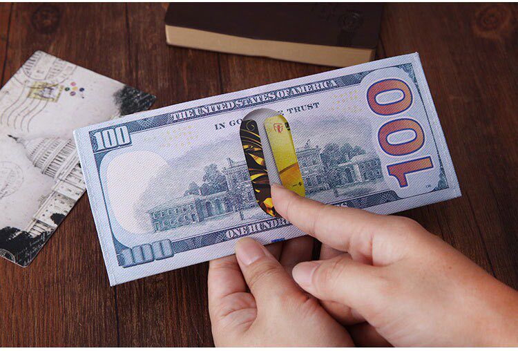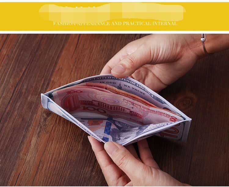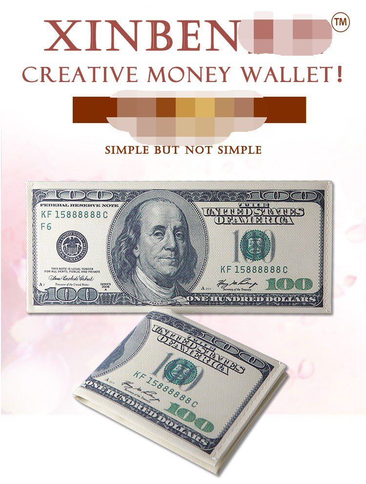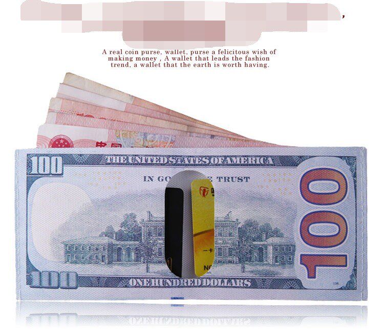 Незвичайний гаманець, малюнок на якому має вигляд точно як грошова банкнота. З далекого гаманець можна прийняти за купюру. Оригінальний вигляд гаманця банкноти дасть змогу здивувати будь-якого знайомого. Також приносить удачу своєму власнику!