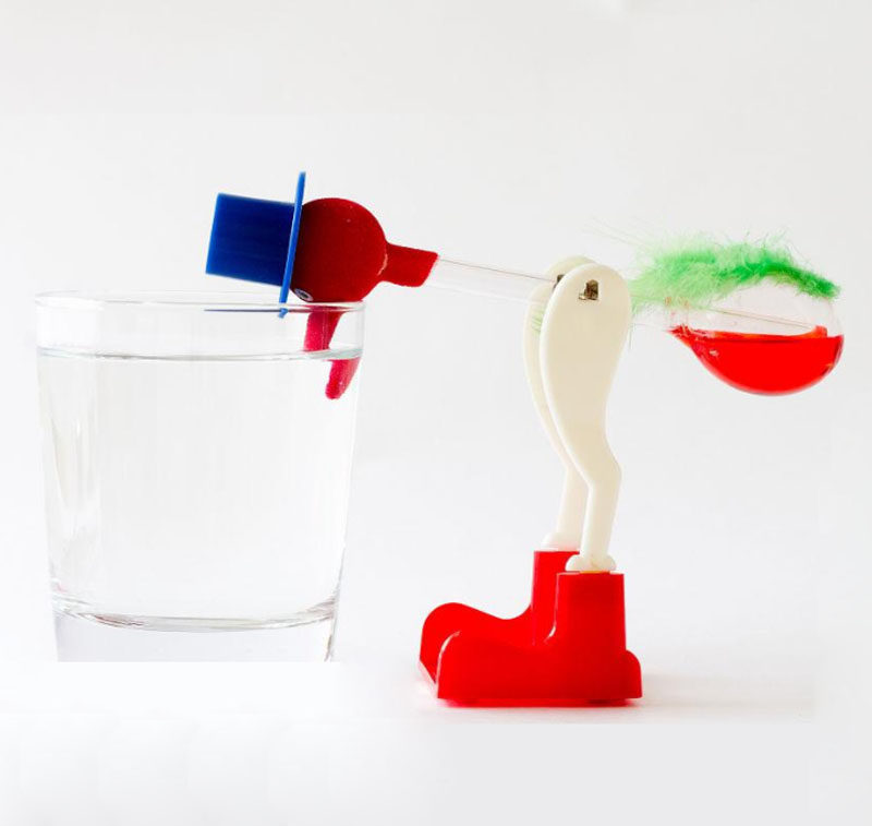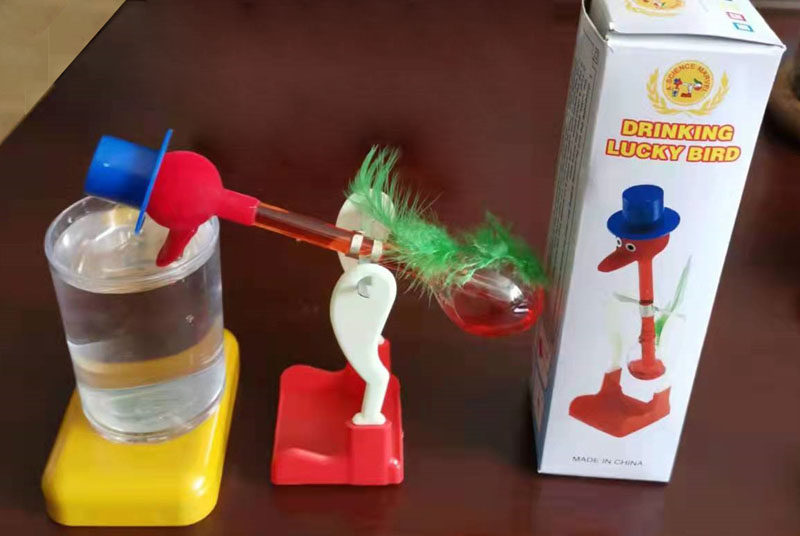 Розташована пташка на підставці з водою,  занурте її голову у воду. Пташка починає пити, і цей процес, здається, буде безперервним. Чому? Спочатку циклу, тулуб пташки є у вертикальному положенні. Видно, як на тулубку вгору підіймається рідина. Унаслідок цього центр ваги стає вищим від точки опори, конструкція стає нестійкою. Туловище пташки нахиляється, і нього (трубочку), повітря з нижньої частини тулуба проходить у голову пташки — вгору. Піднялася рідина, стікає вниз. Пташка знову набуває вертикального положення, і цикл відновлюється. Перед нами наочний демонстратор сил тиску.
