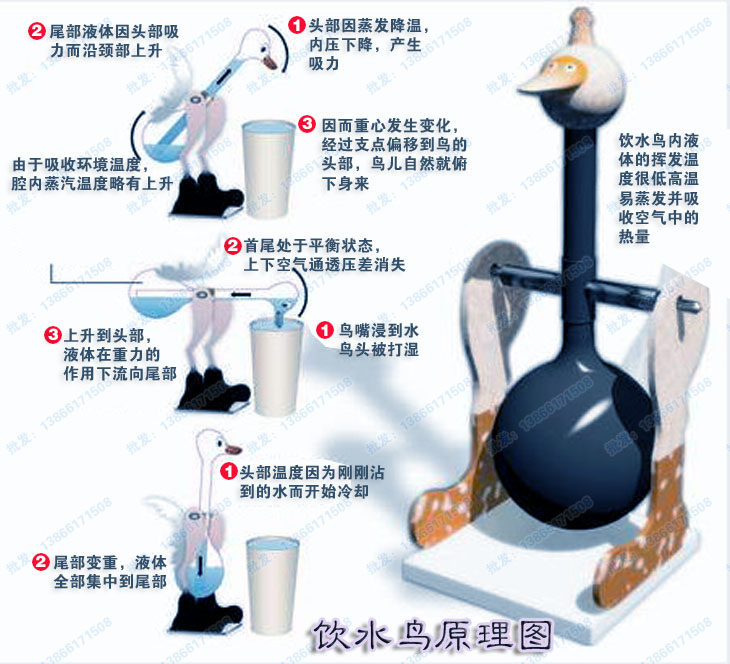 Тому що кінетична енергія пивальної птиці виходить із двох аспектів: 1. Низькокипна рідина всередині склоподібного тіла птиці випаровується і конденсується, і стан змінює вагу; 2. Зовнішня «невагомість» завдяки випаровуванню вода в голові птиці порушує баланс і утворює